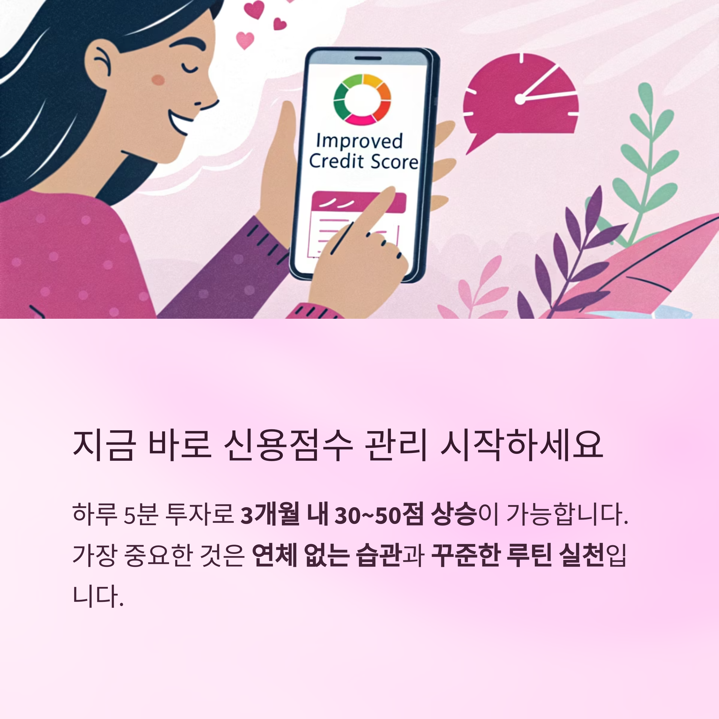 신용점수는 하루 5분 투자만으로도 충분히 관리하고 높일 수 있습니다. 자동이체 설정, 카드 사용 관리, 비금융 정보 제출, 신용정보 오류 정정까지 꾸준한 루틴 실천만으로도 3개월 내 30~50점, 단기 조치만으로도 20점 이상 상승할 수 있습니다. 연체 없는 습관이 가장 중요하며, 하루 5분의 작은 습관이 장기적 금융 이익으로 연결됩니다. 지금 바로 신용점수 관리, 시작하세요.