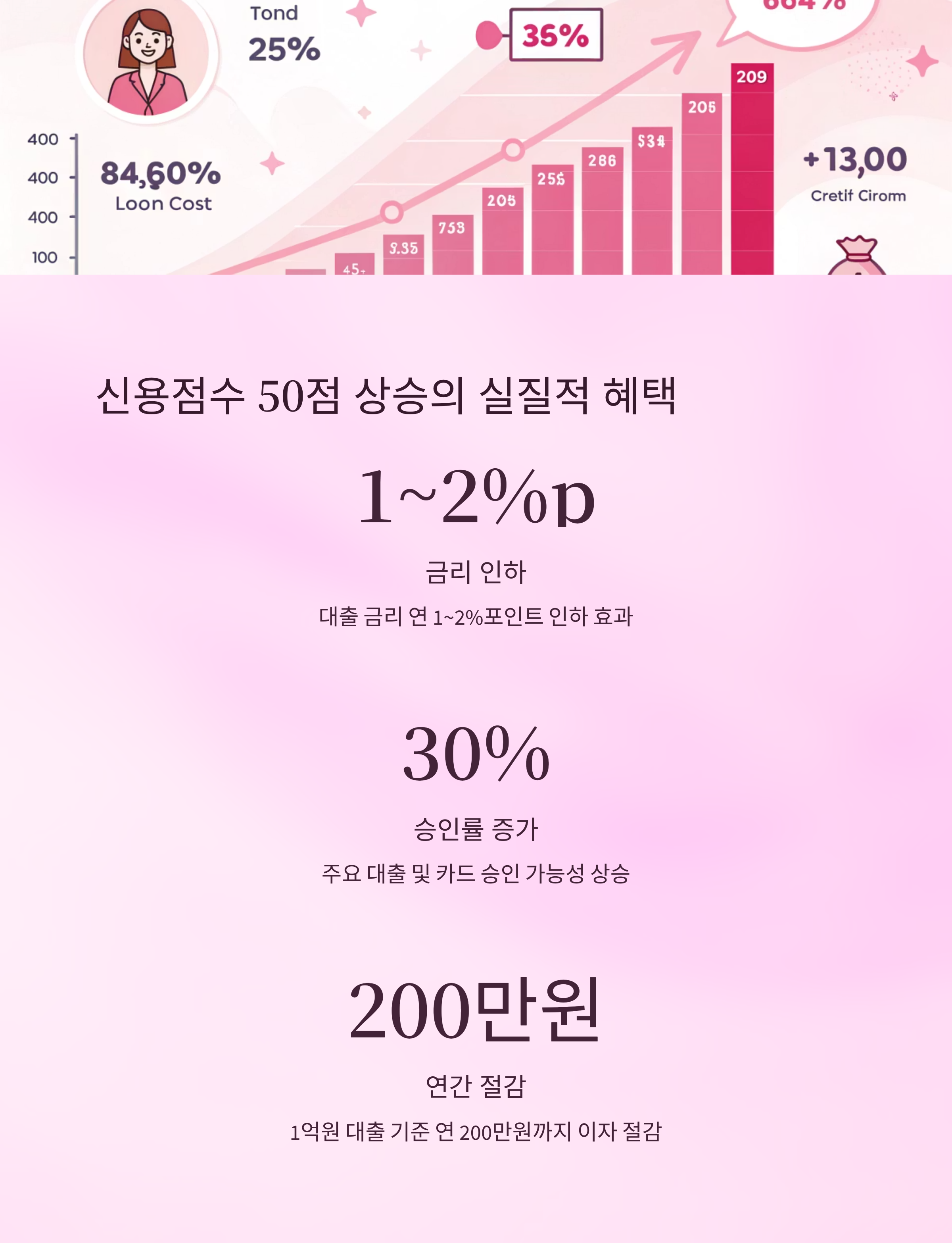 신용점수 50점 상승 시 기대할 수 있는 효과는 다음과 같습니다. 대출 금리 연 1~2%p 인하, 대출 승인률 증가, 신용카드 한도 상승, 각종 금융상품 우대혜택 제공. 예시: 1억 원 대출 기준 연 100만~200만 원 이자 절감 효과.