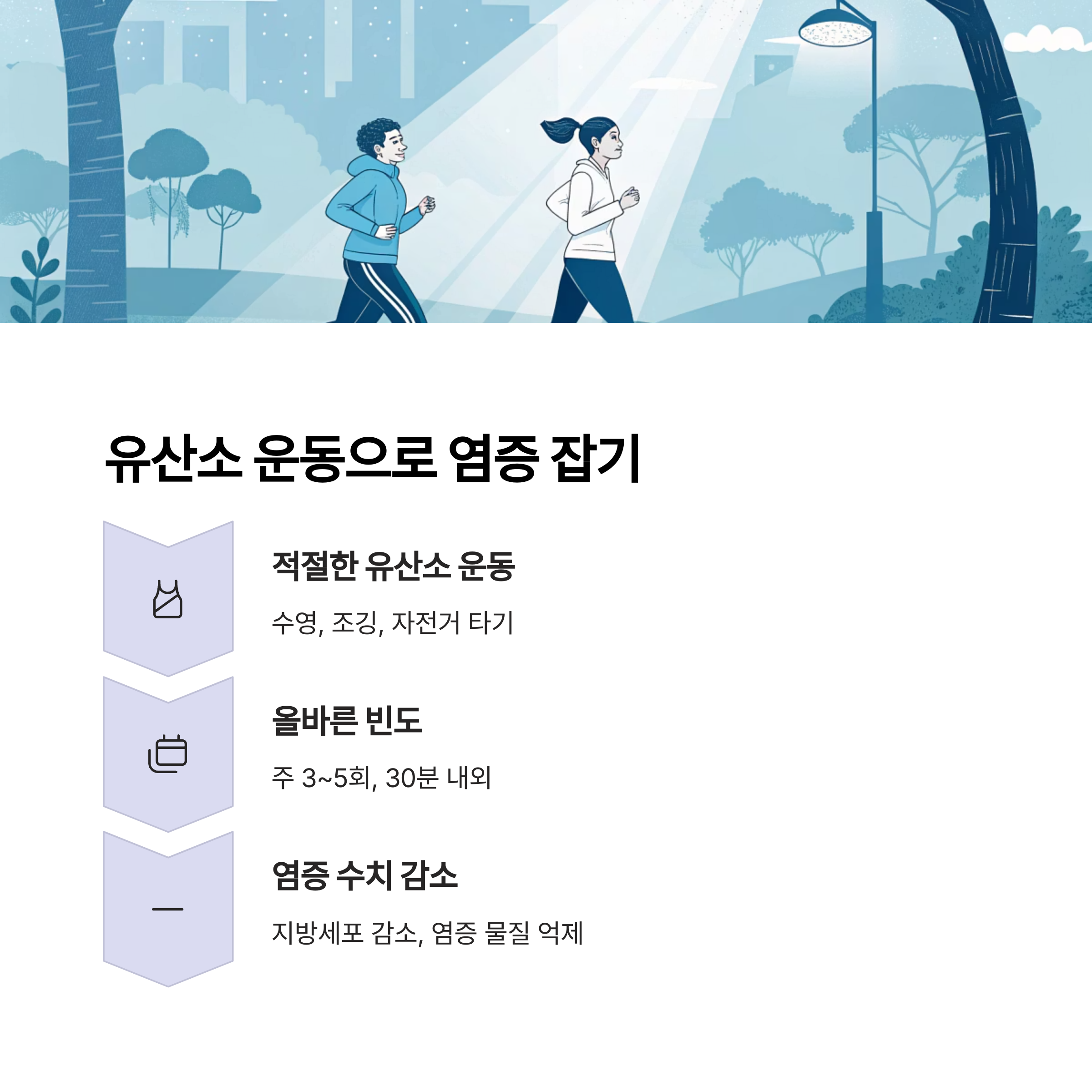 유산소 운동은 지방세포를 줄이고 체내 염증 수치를 낮추는 핵심 수단입니다. 단, 과도한 운동은 오히려 피로를 악화시킬 수 있으므로, 적절한 강도와 주기(예: 일주일에 3~5회, 30분 내외)가 중요합니다.