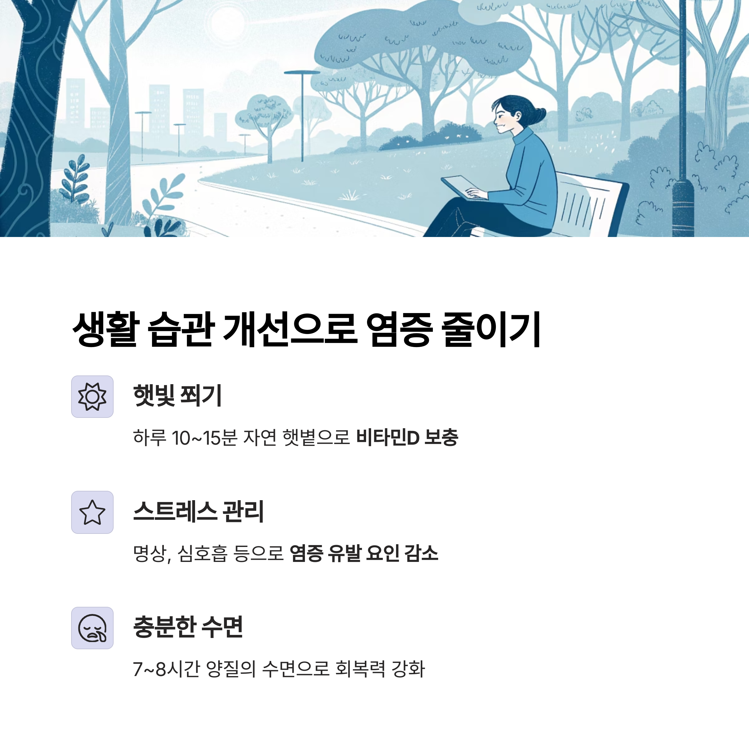 스트레스는 염증 유발과 피로 악화의 주요 원인입니다. 하루 10~15분 자연 햇볕을 쬐며 비타민D를 보충하면 염증 감소에 도움이 됩니다. 단, 미세먼지가 심한 날에는 외출 시 마스크 착용이 필수입니다.