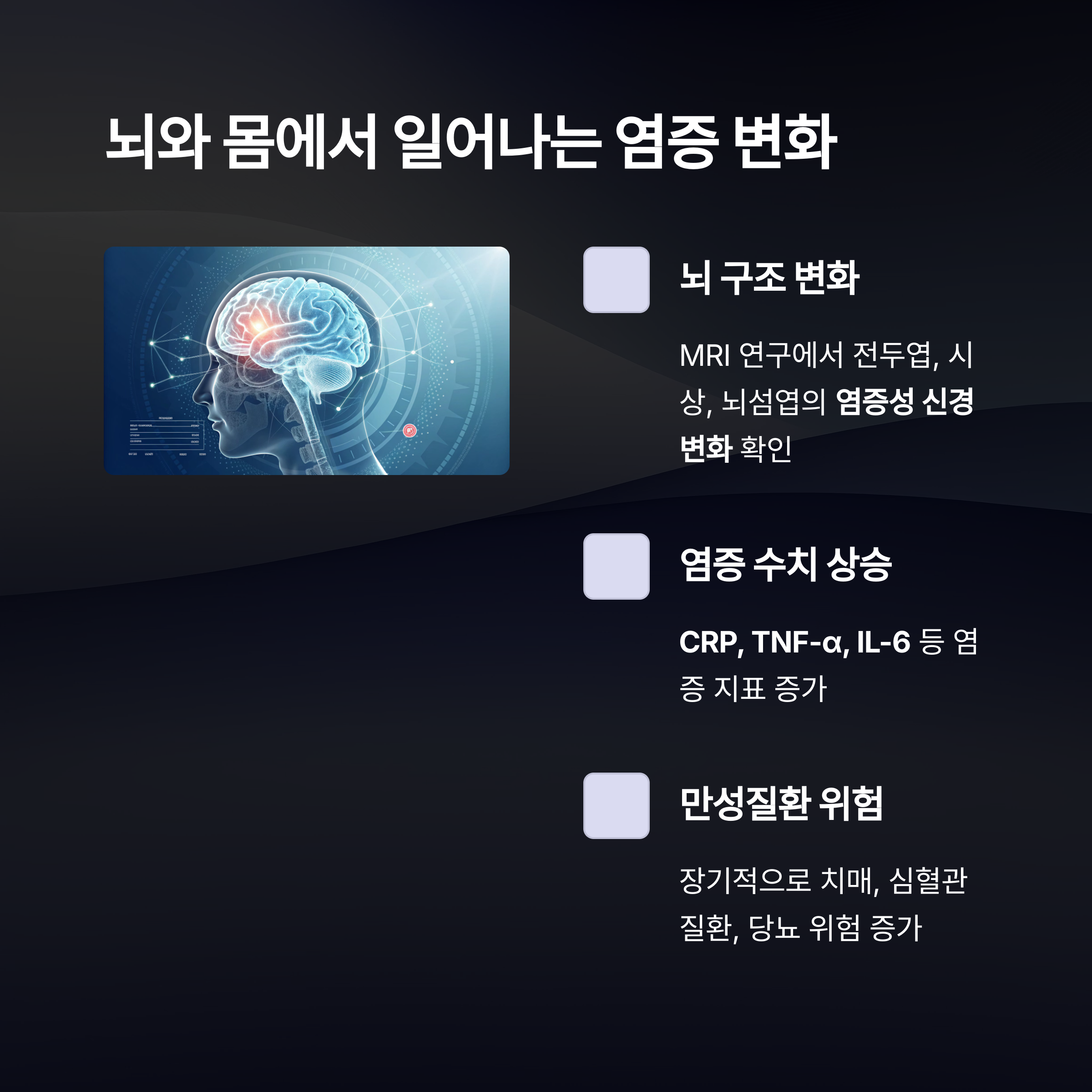 만성피로증후군 환자의 뇌를 MRI로 분석한 연구에서는 전두엽, 시상, 뇌섬엽 등에서 염증성 신경 변화가 확인되었습니다. 이러한 뇌 구조의 변화는 피로, 기억력 저하, 수면장애와 밀접하게 관련되어 있습니다. 또한, CRP, TNF-α, IL-6 등의 염증 수치 상승은 신체 곳곳에 손상을 일으키며 만성질환의 위험성을 높입니다. 이는 장기적으로 치매, 심혈관질환, 당뇨 등으로 이어질 수 있어 조기 관리가 필수적입니다.