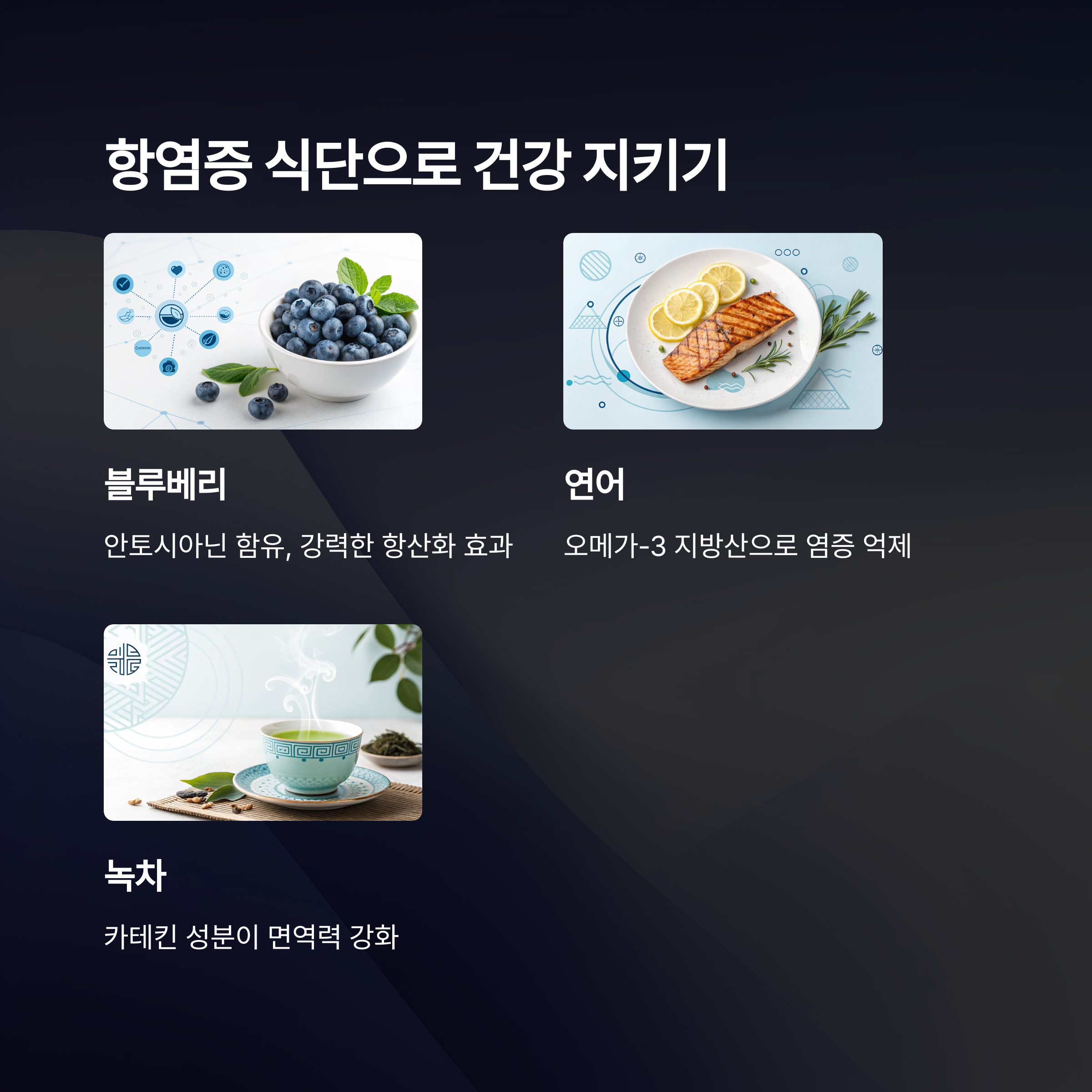 항산화 성분이 풍부한 식품(블루베리, 녹차, 견과류)와 오메가-3 지방산(