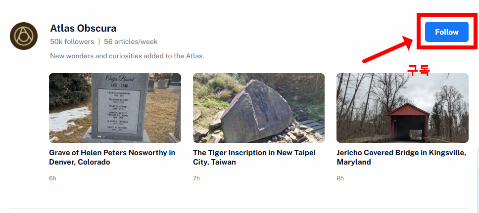 - 2단계: 관심사 '구독'하기! 검색창에 보고 싶은 웹사이트나 블로그 이름을 입력하고 '팔로우' 버튼을 눌러 구독을 추가합니다.