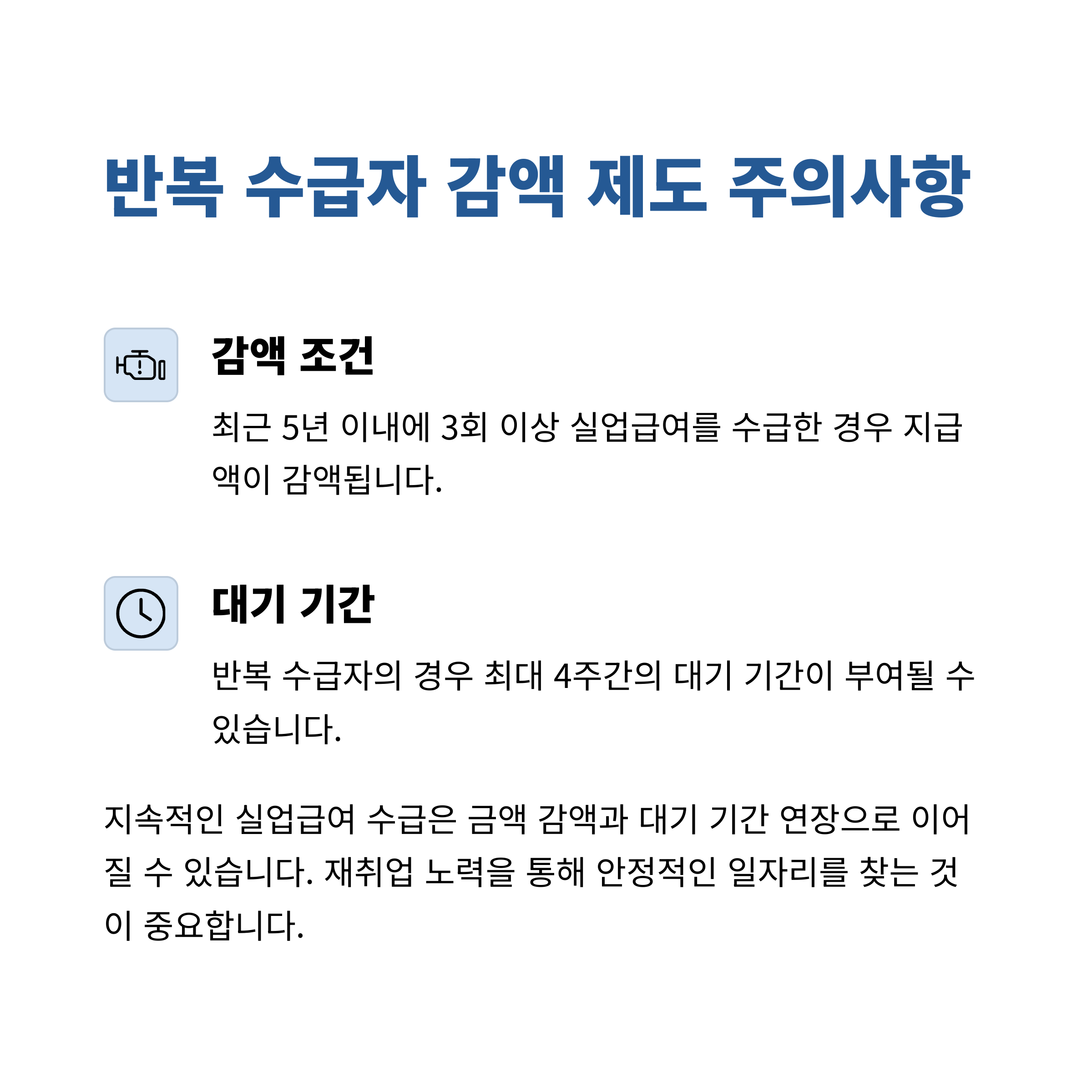 - 반복 수급 감액제 강화: 다회 수급자에게 감액과 대기기간 부여