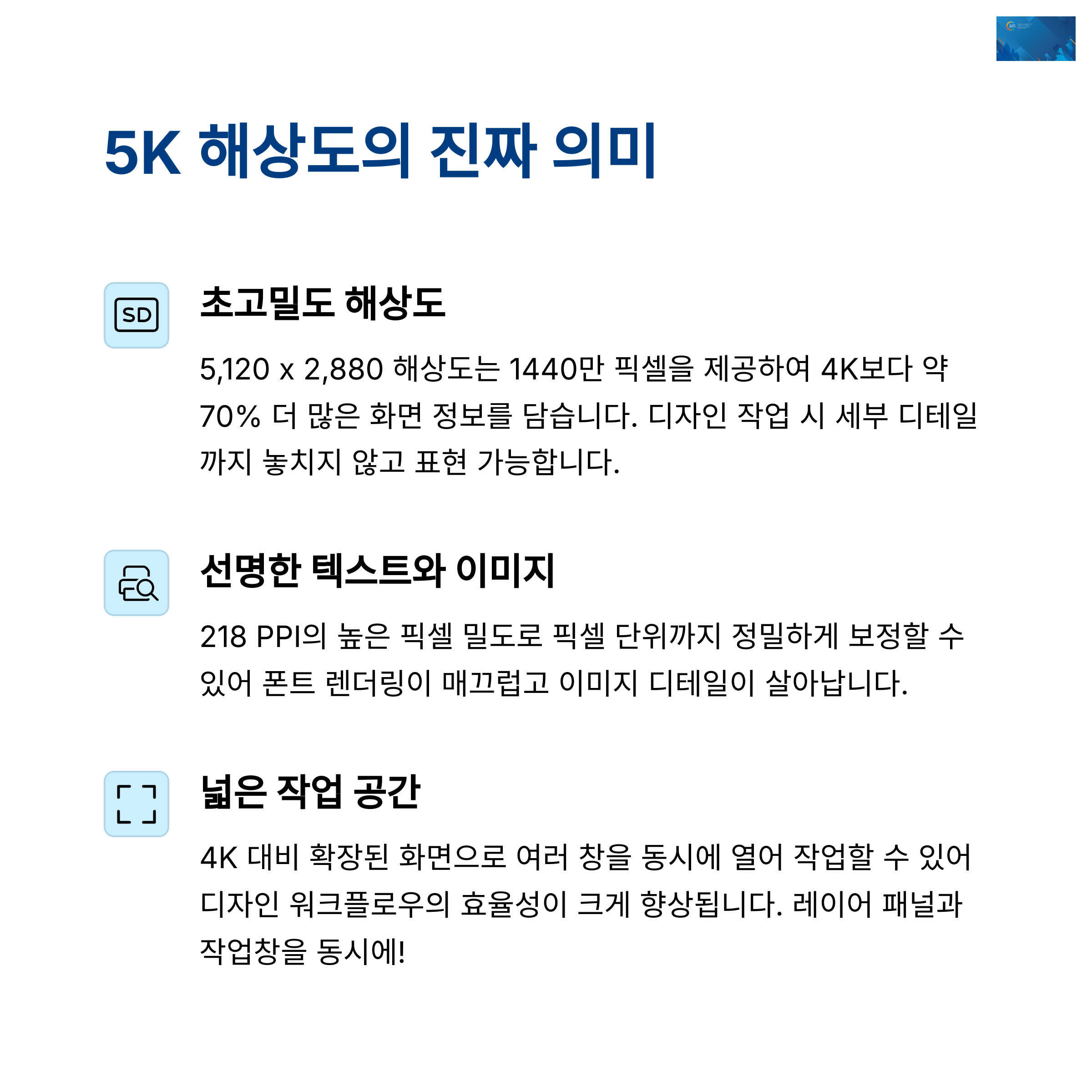 작업 공간이 4K 대비 약 77% 더 넓어진다는 실질적인 장점이 있습니다.