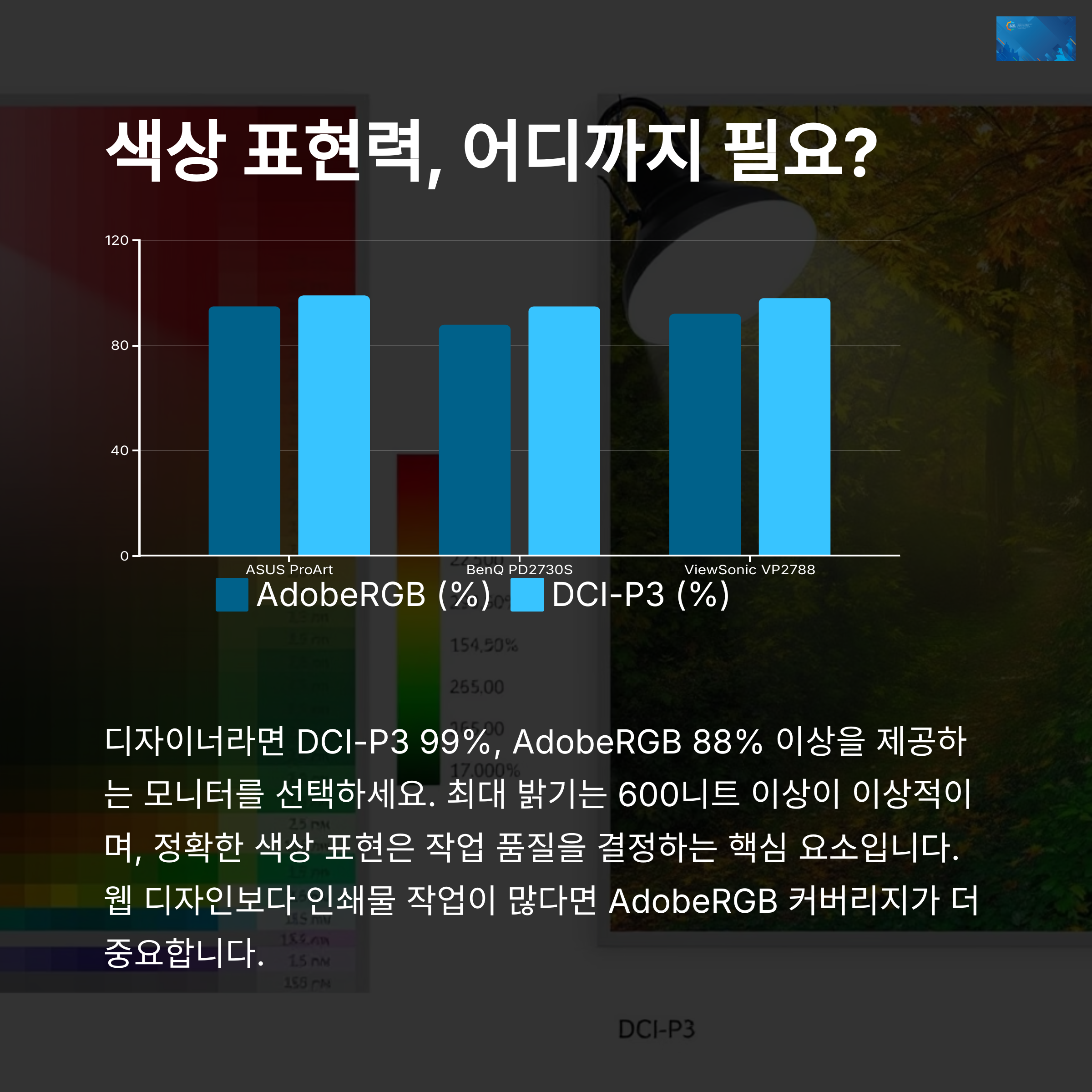 전문 디자이너용 모니터는 AdobeRGB 기준 최소 89%, DCI-P3 98% 이상이 권장됩니다.