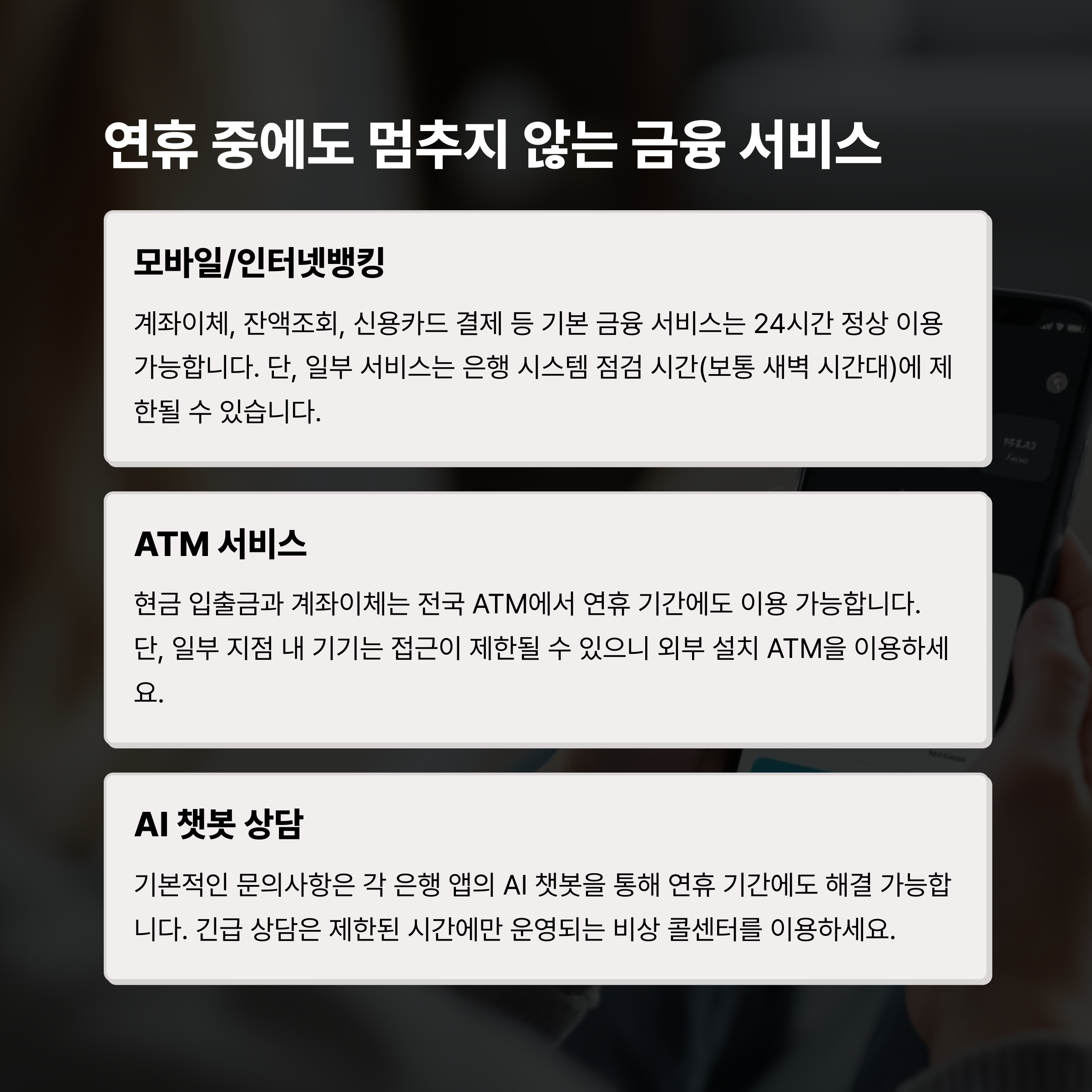 창구는 문을 닫지만, 비대면 금융 서비스는 정상적으로 운영됩니다.