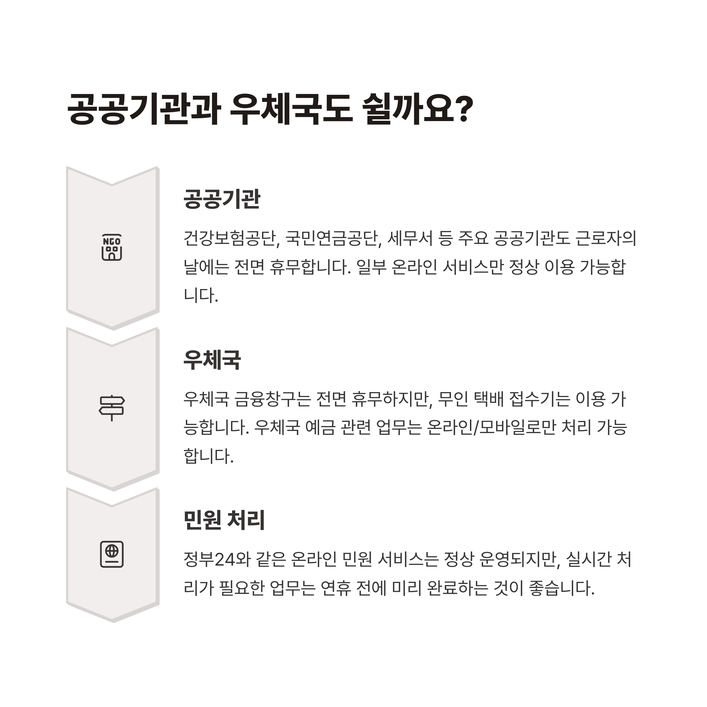 - 주민센터, 구청 등: 5월 1일과 5일은 필수 휴무