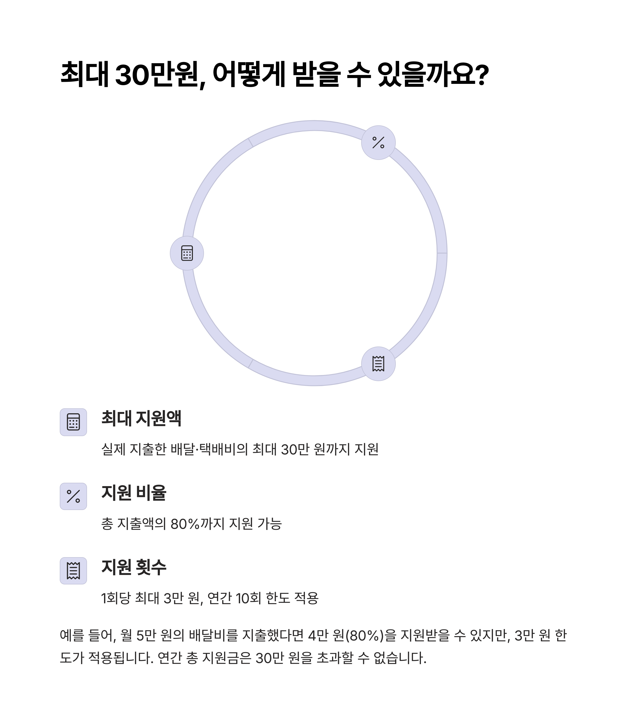 최대 30만 원까지 지원되며, 직접 배달 실적은 1건당 5천 원으로 환산합니다.
