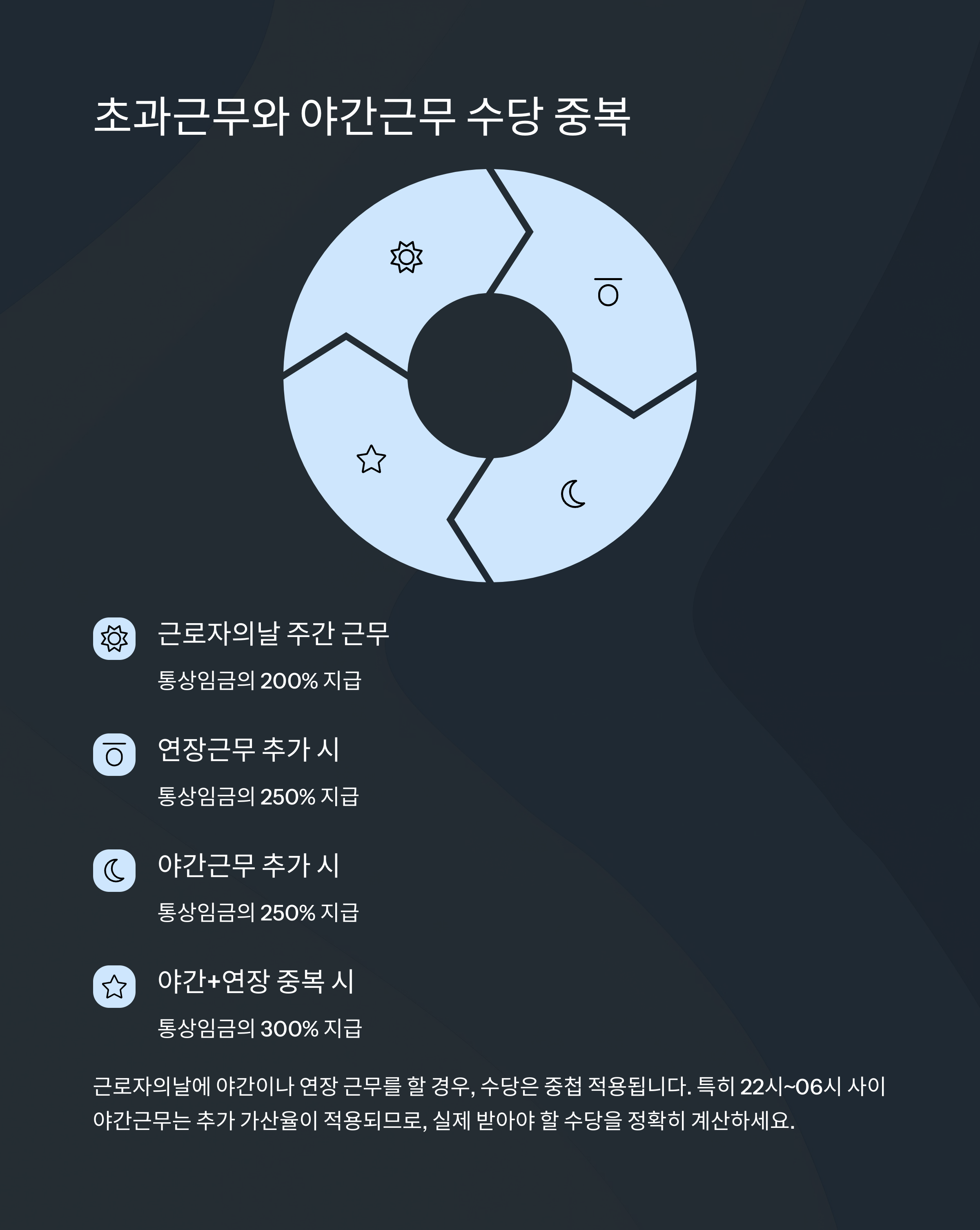 - 초과근무와 야간근무가 겹치면 가산수당을 중복 적용합니다