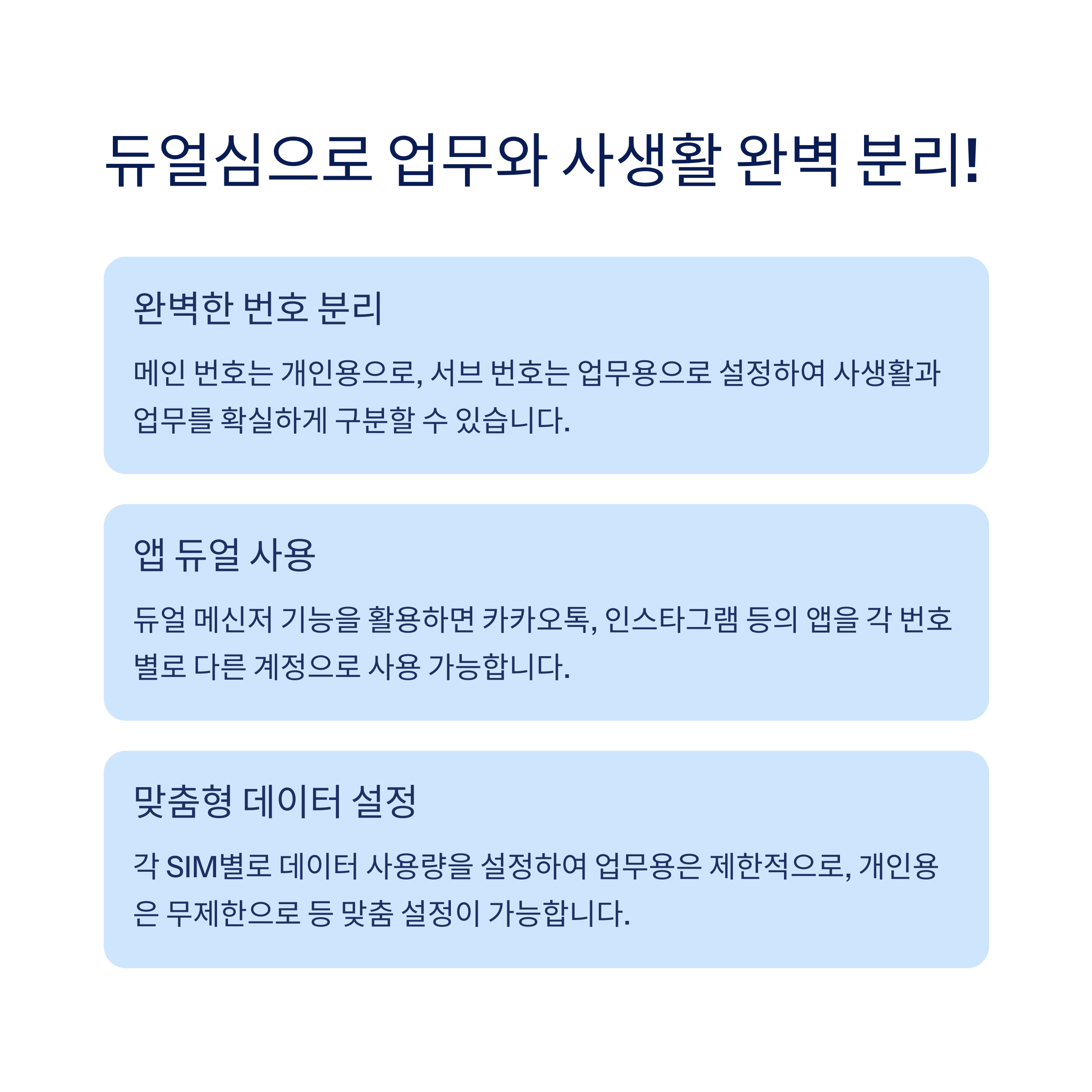 듀얼 번호 사용이 가능해져 업무용과 개인용을 분리하거나, 해외여행 시에도 유용하게 활용할 수 있습니다.