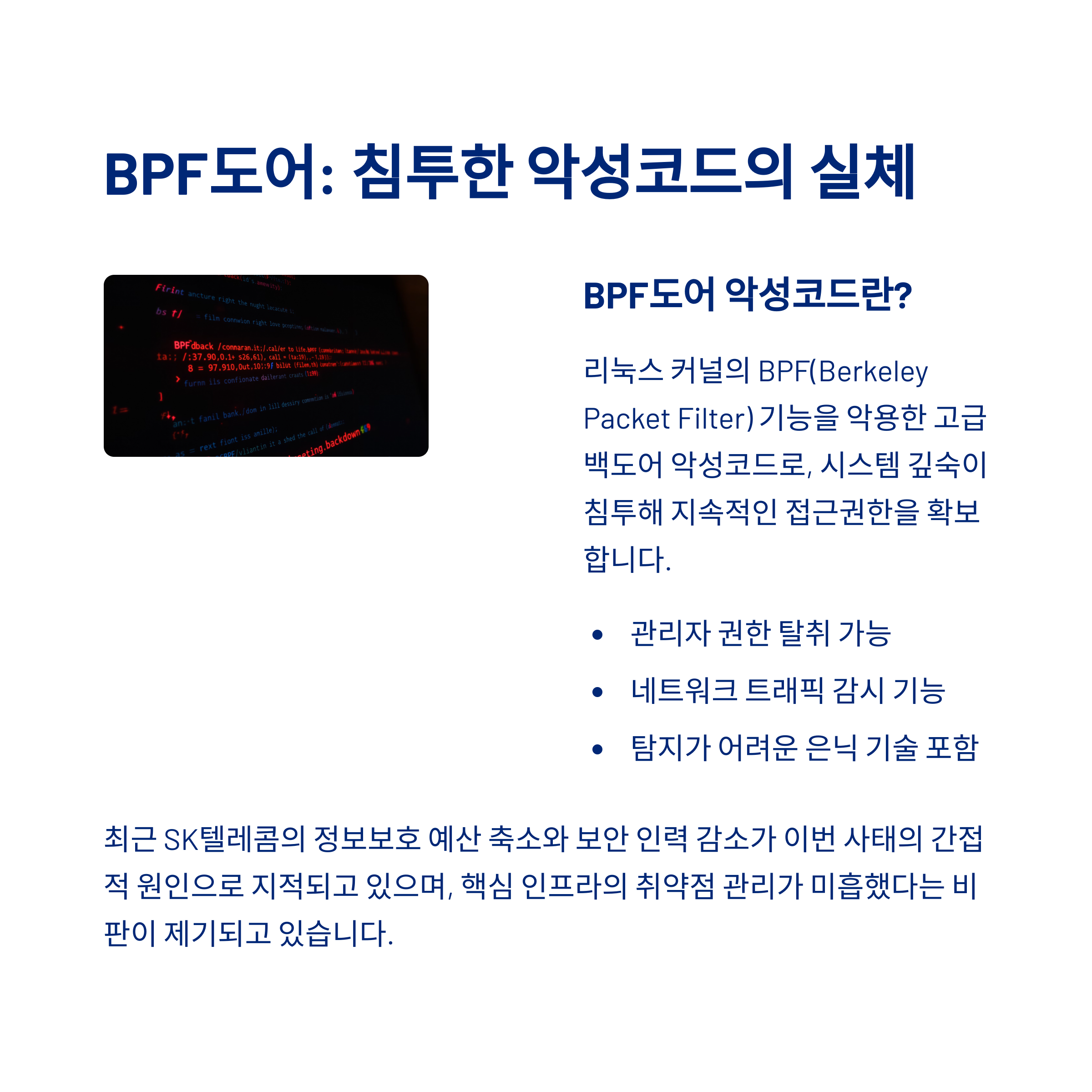 이번 공격은 리눅스 서버를 겨냥한 고급 악성코드인 **BPF도어(BPFDoor)**를 사용하여 이루어졌습니다.