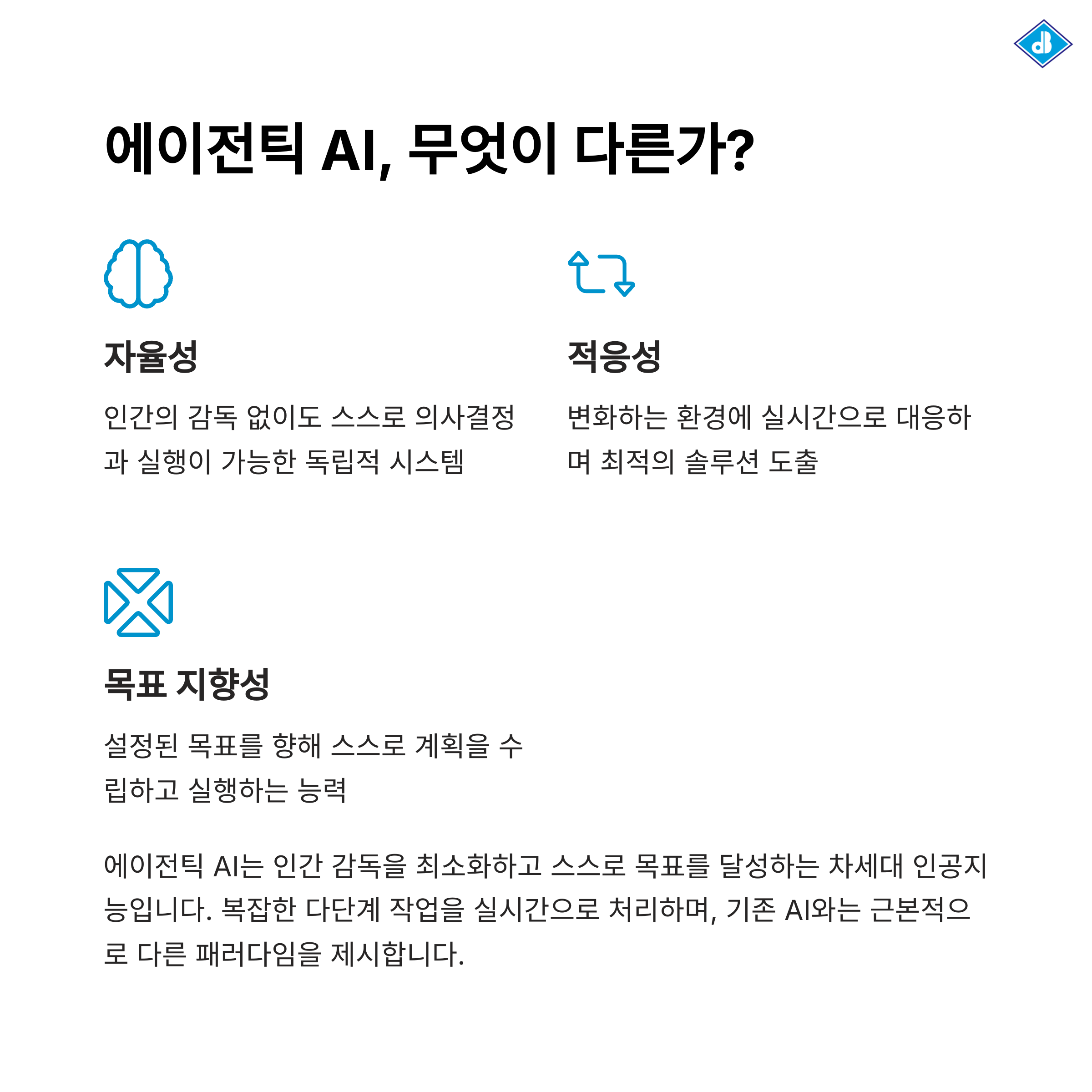 에이전틱 AI는 단순한 명령 수행을 넘어 스스로 목표를 설정하고, 실행하며, 적응까지 가능한 차세대 인공지능입니다.