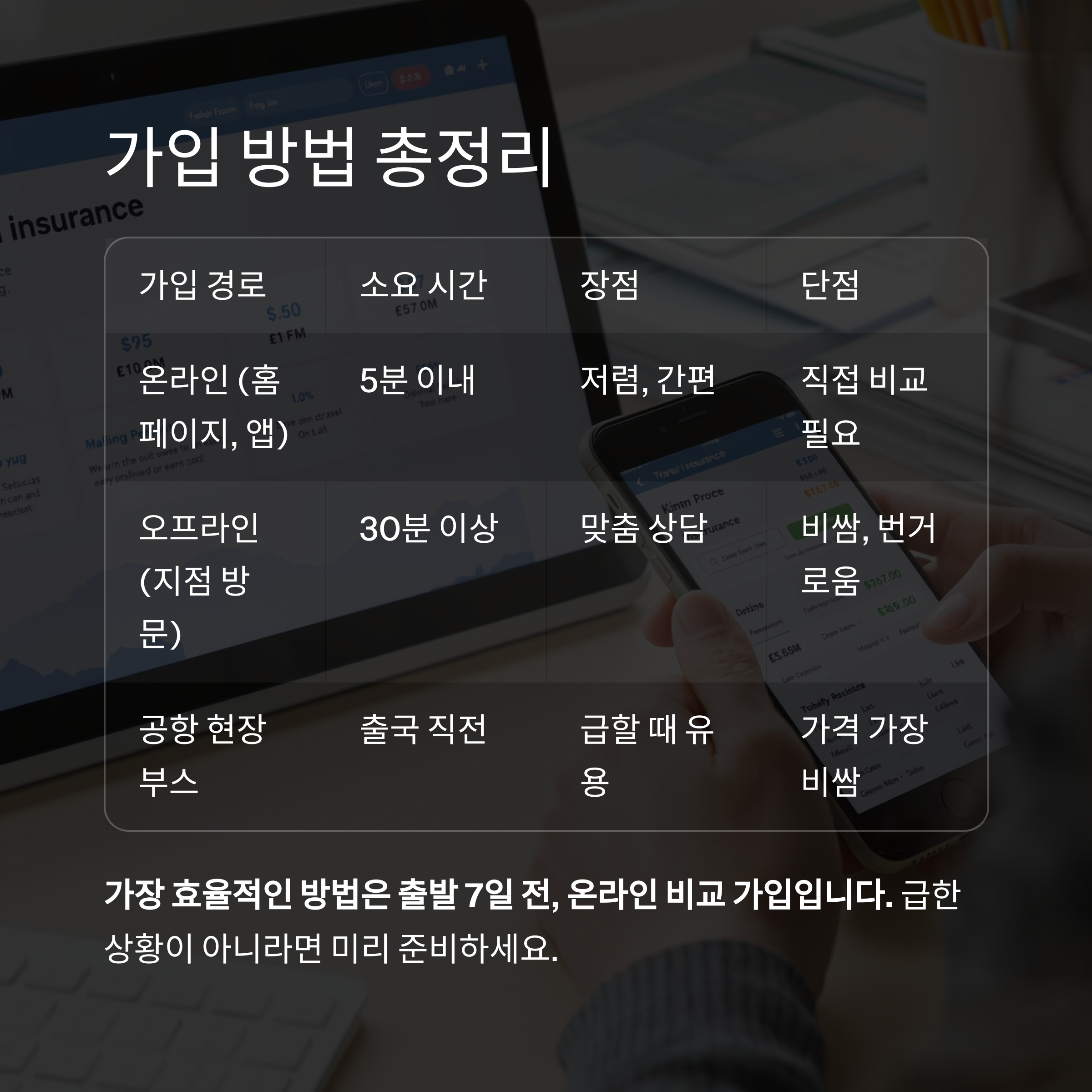 "가장 효율적인 방법은 출발 7일 전, 온라인 비교 가입입니다."