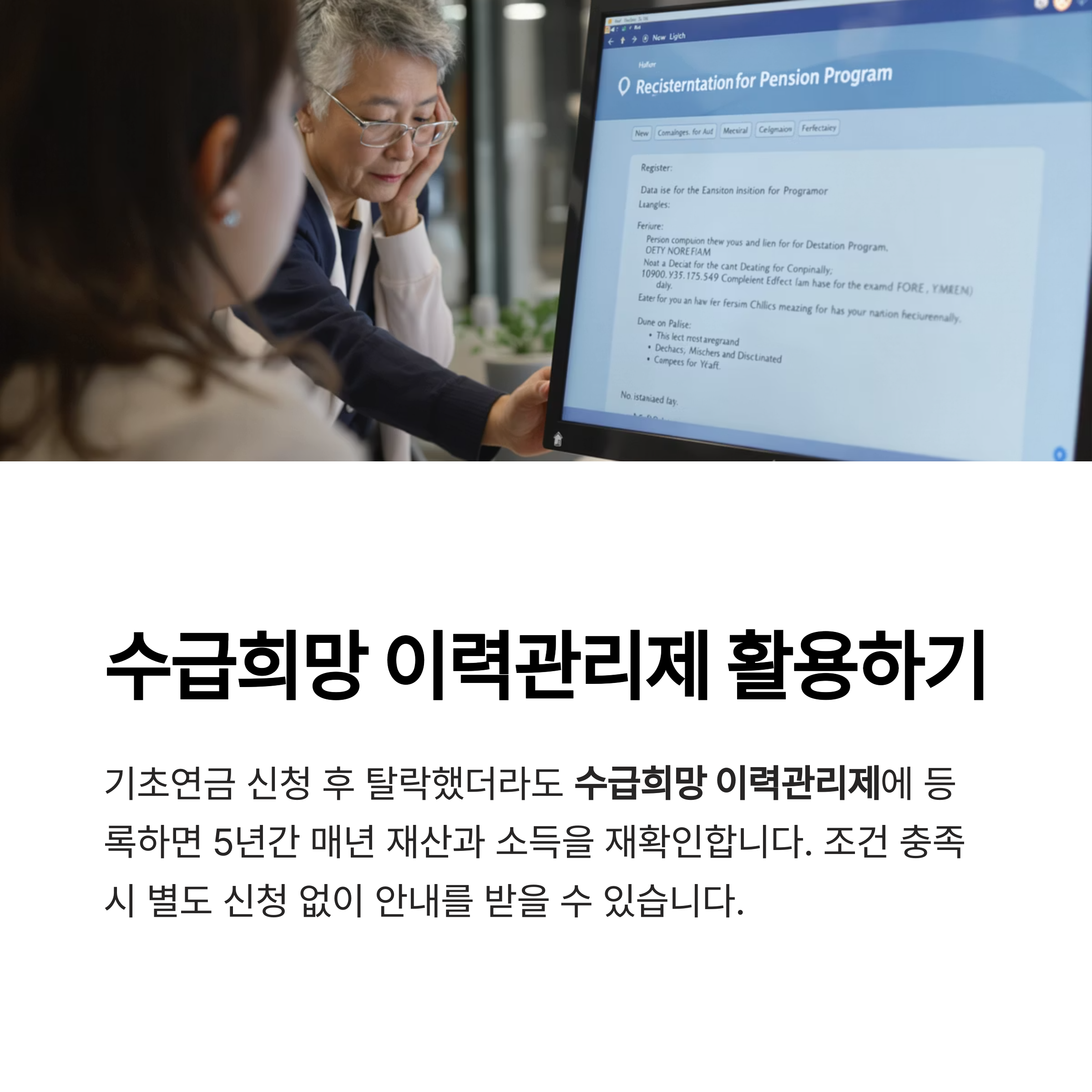 수급희망 이력관리제에 등록하면 5년간 매년 재산과 소득 재확인 후, 조건을 충족하면 별도 신청 없이 안내를 받을 수 있습니다.