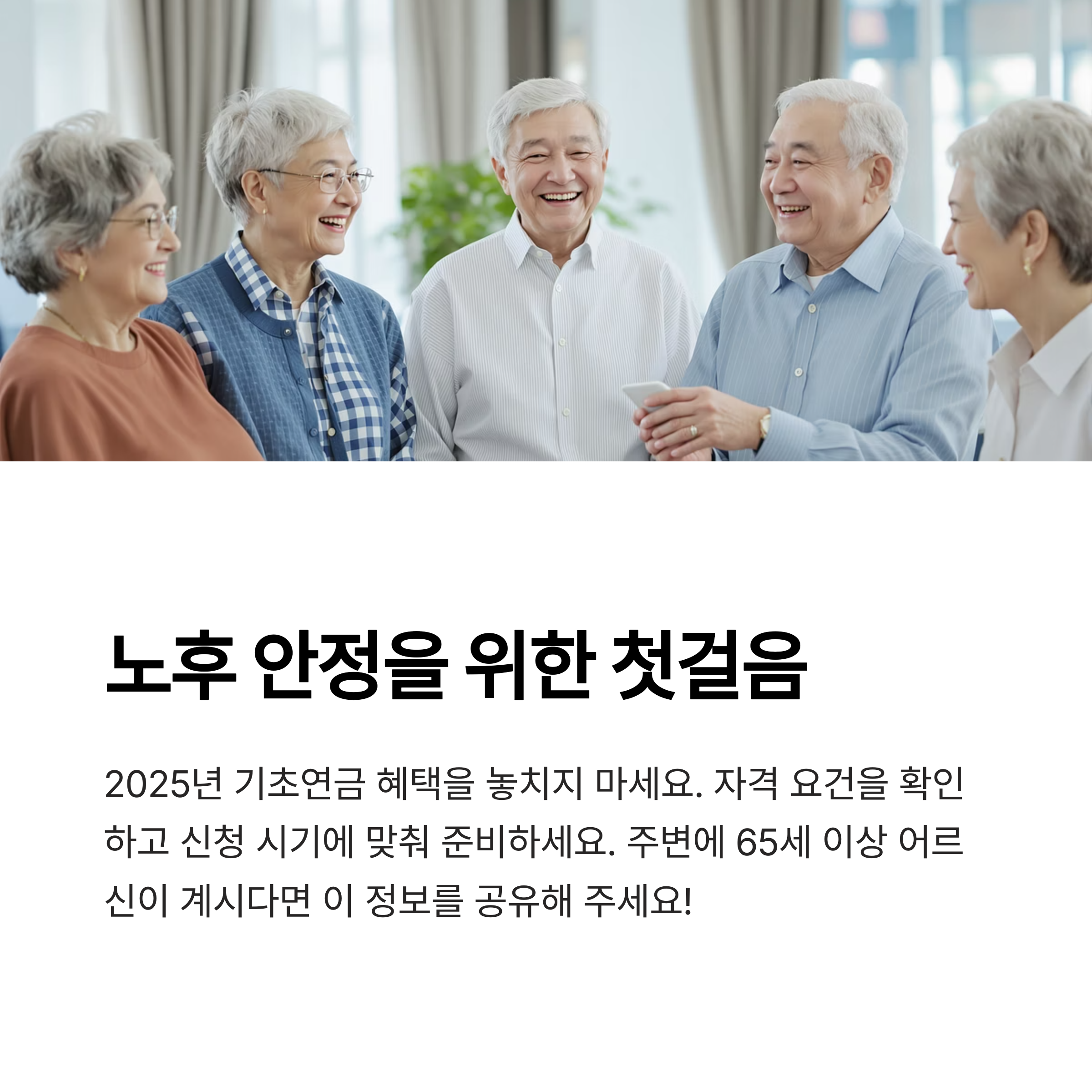 2025년 기초연금의 수급 자격은 다음 세 가지 기준으로 판단됩니다. 첫째, 만 65세 이상. 둘째, 대한민국 국적 보유 및 국내 거주. 셋째, 소득인정액이 기준 이하일 것.