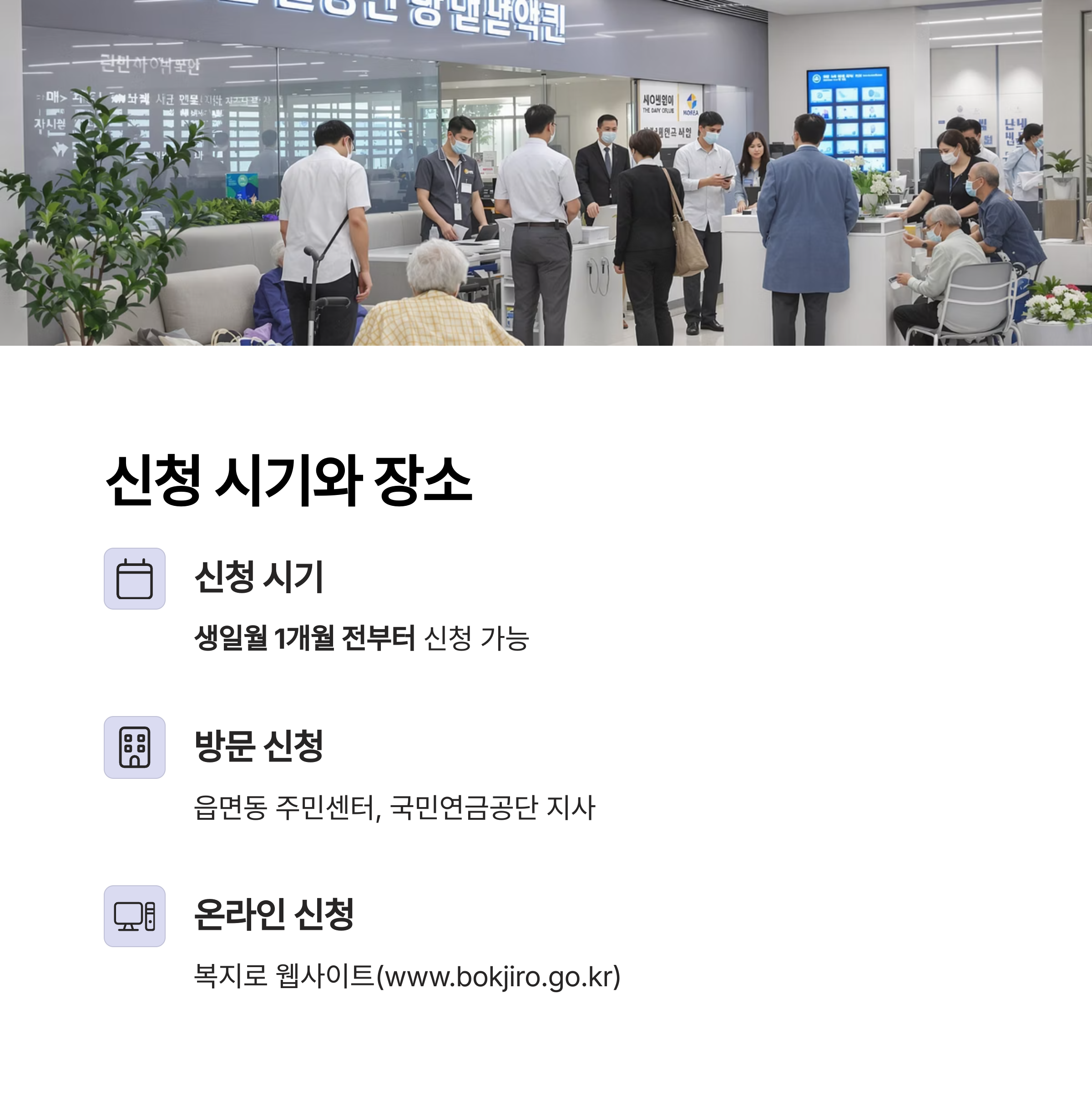 신청 장소는 읍면동 주민센터, 국민연금공단 지사, 또는 복지로(www.bokjiro.go.kr) 온라인 창구를 통해 가능합니다.
