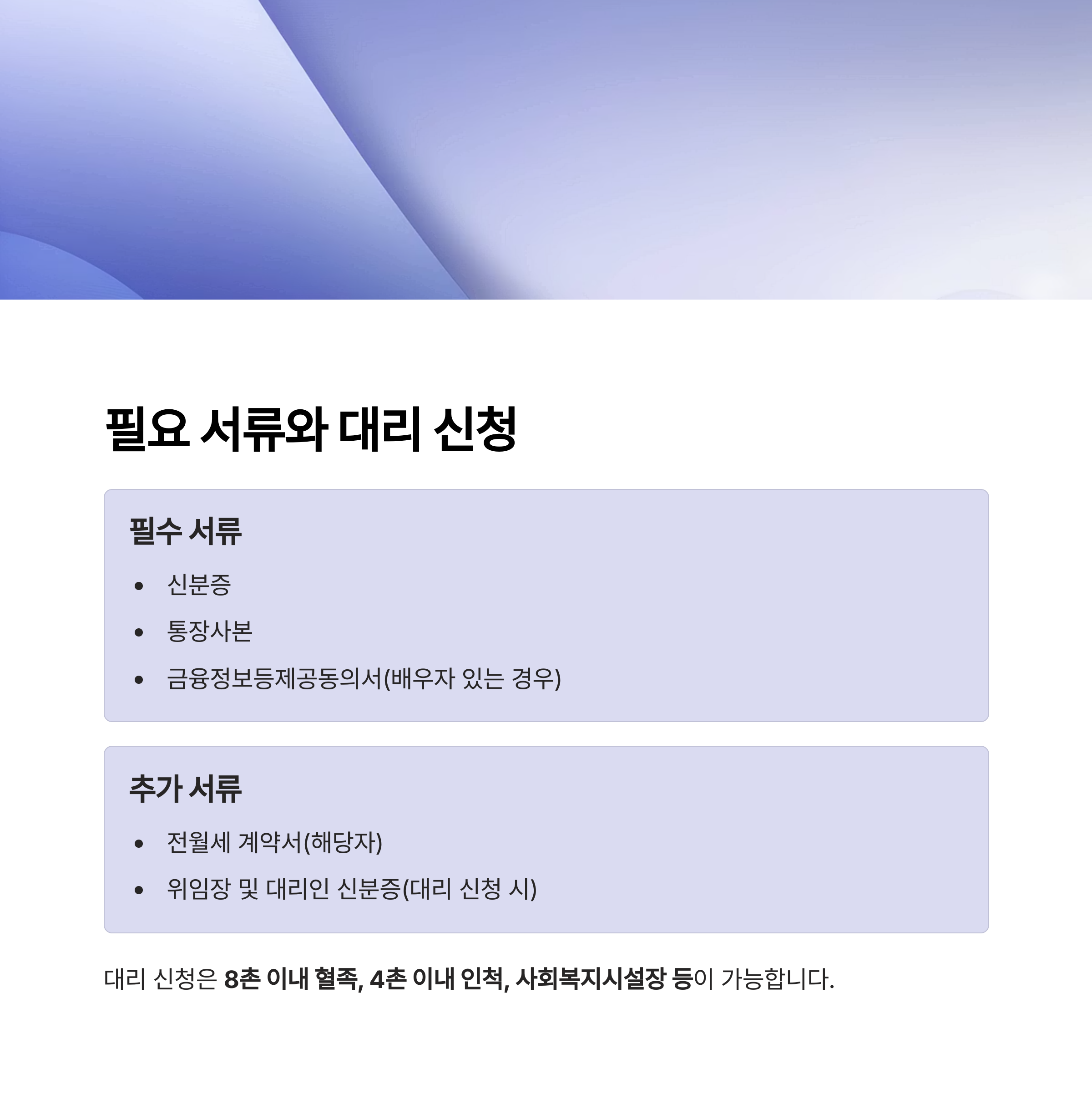 대리 신청은 8촌 이내 혈족, 4촌 이내 인척, 사회복지시설장 등이 가능하며, 적절한 서류 구비가 필요합니다.