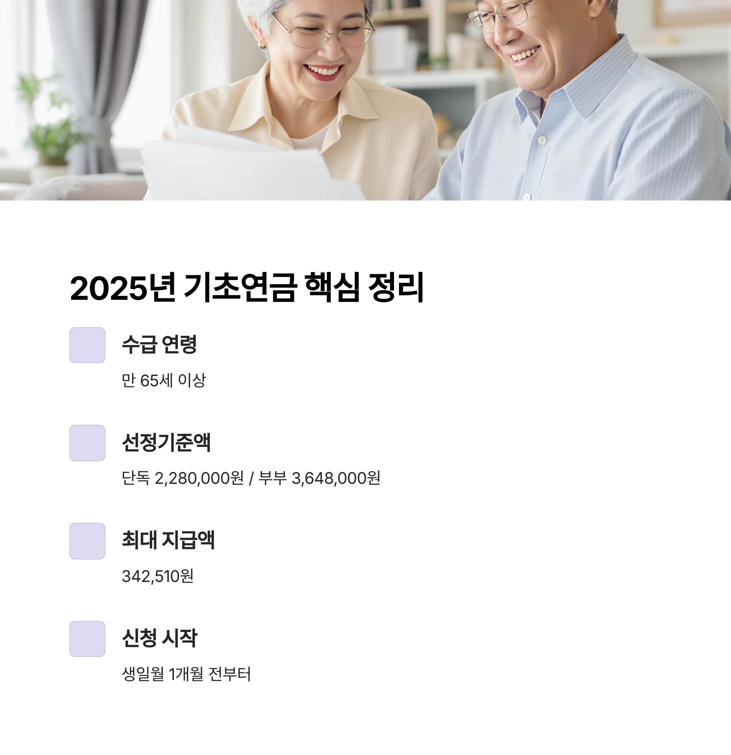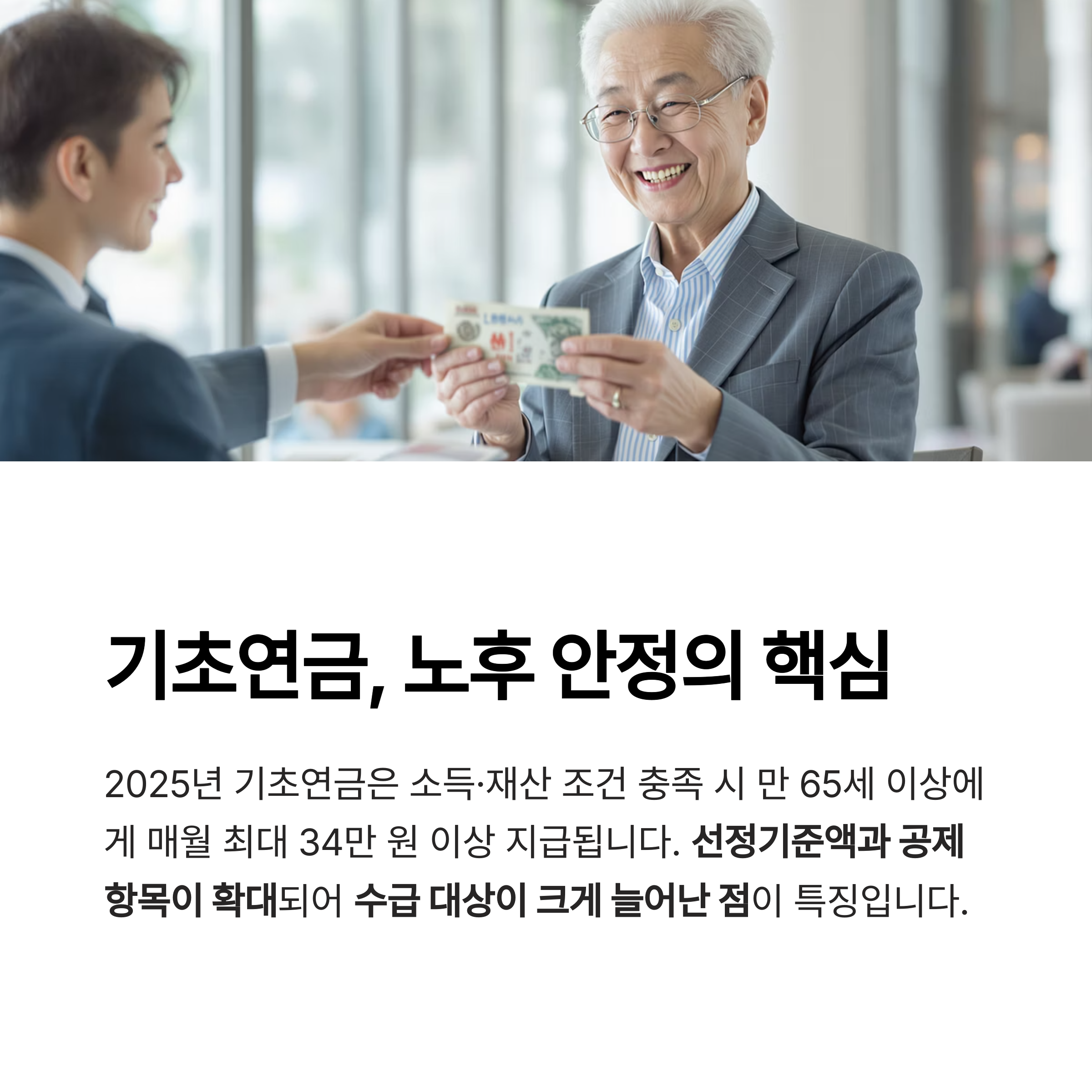 2025년 기초연금은 노후 안정의 핵심 제도로, 소득과 재산 조건을 충족하는 만 65세 이상 국민에게 매월 최대 34만 원 이상을 지급합니다. 올해는 특히 선정기준액과 공제 항목이 확대되며 수급 대상이 크게 늘어난 점이 특징입니다. 본문에서는 자격 요건, 주요 변경사항, 신청 절차를 중심으로 실질적이고 구체적인 정보를 정리합니다.