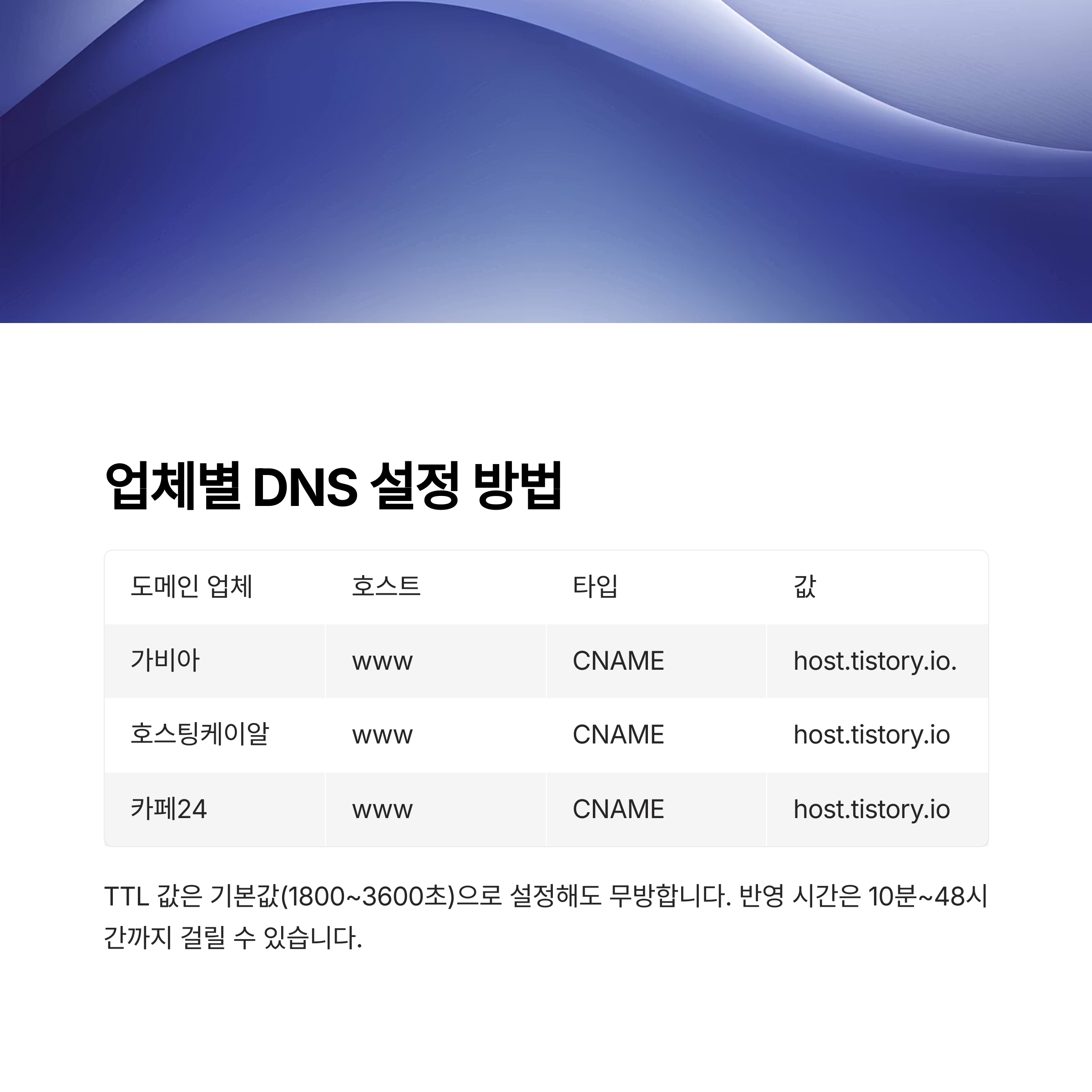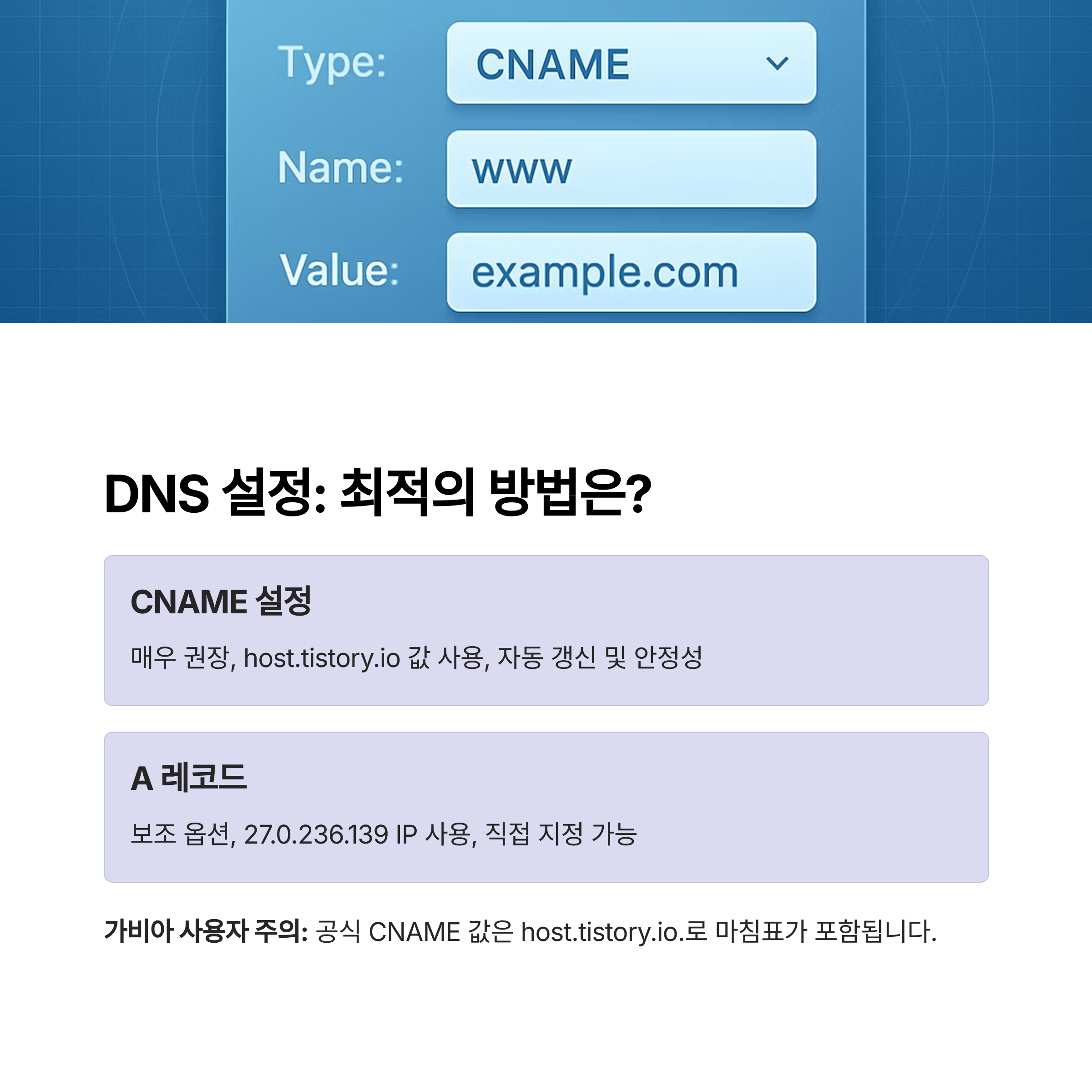 | CNAME | 매우 권장 | host.tistory.io 또는 custom.tistory.com | 자동 갱신, 안정성 |