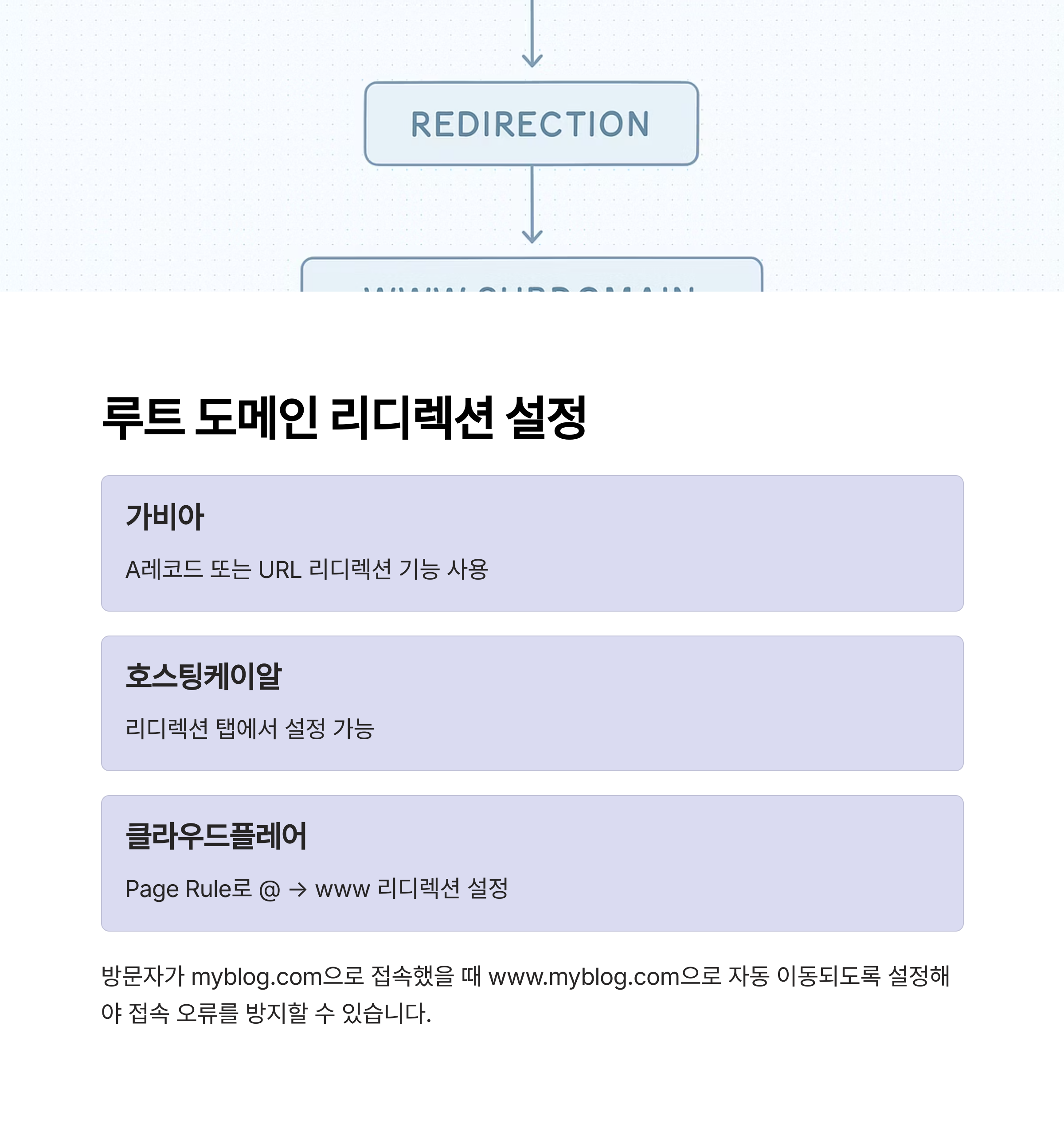 | 클라우드플레어 | Page Rule로 @ → www 리디렉션 설정 가능 |