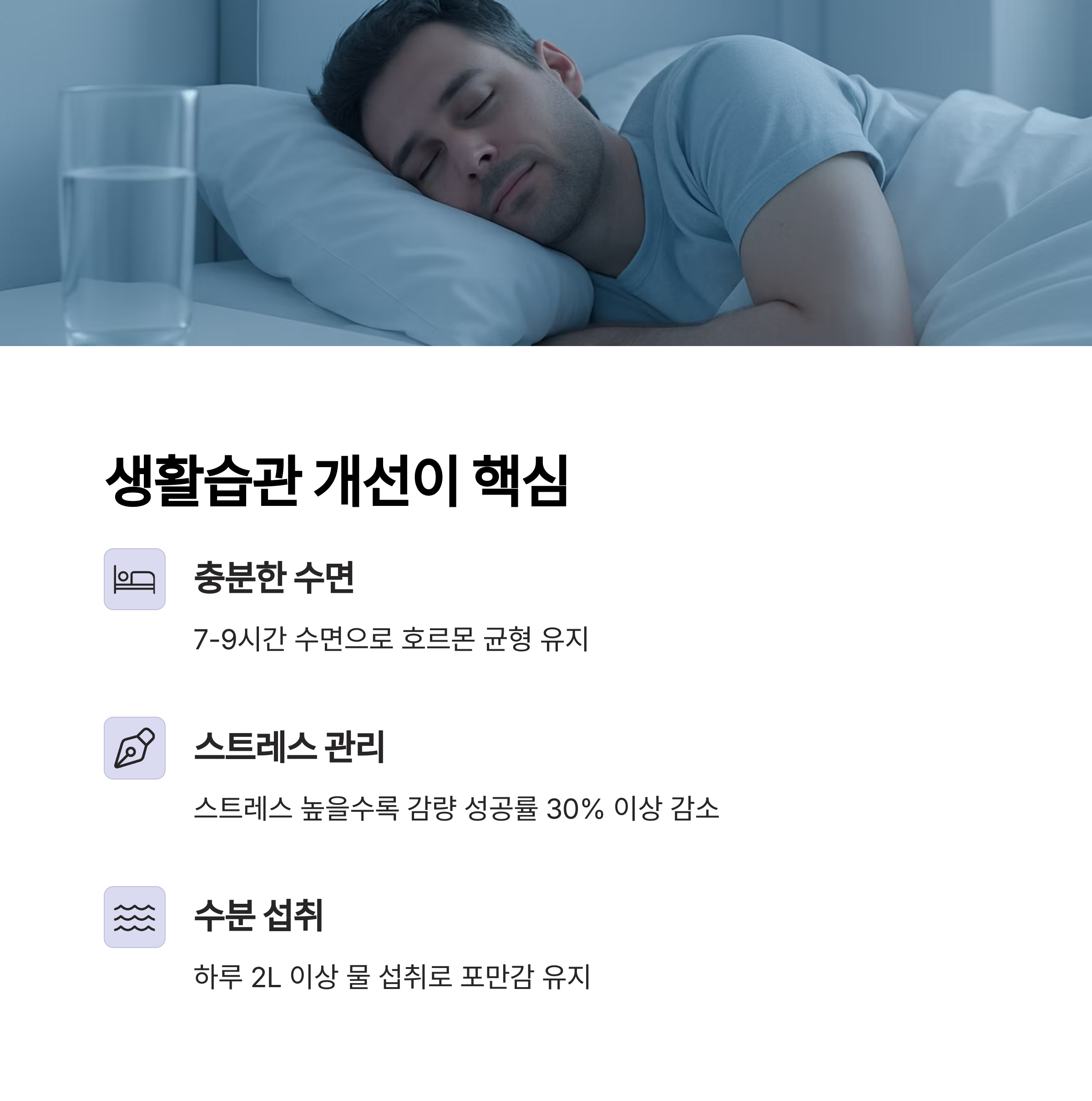 | 수면 패턴 안정화 | 하루 7~9시간, 동일 시간에 취침/기상 | 호르몬 균형 유지, 과식 방지 |
