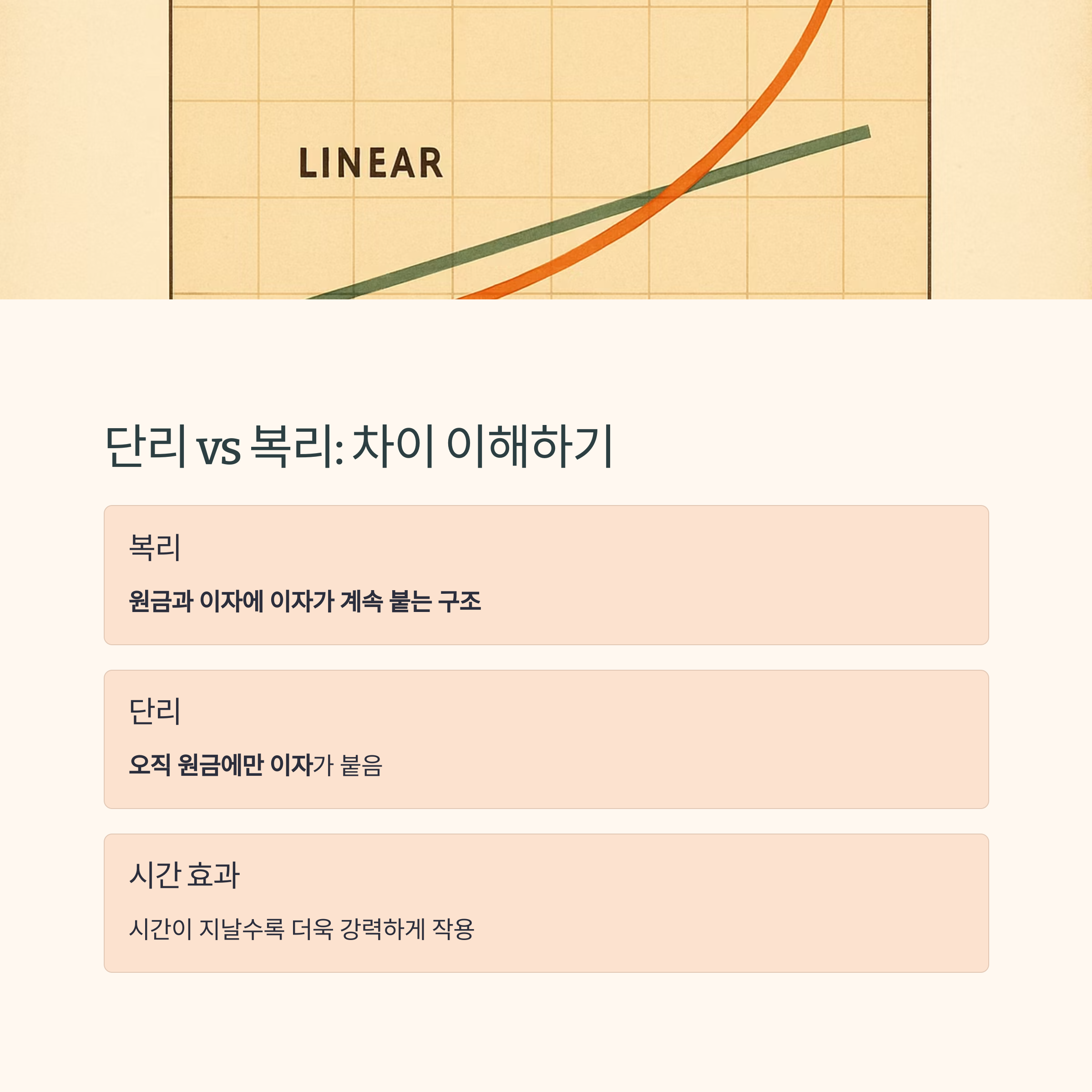 복리는 원금과 이자에 이자가 계속 붙는 구조입니다.