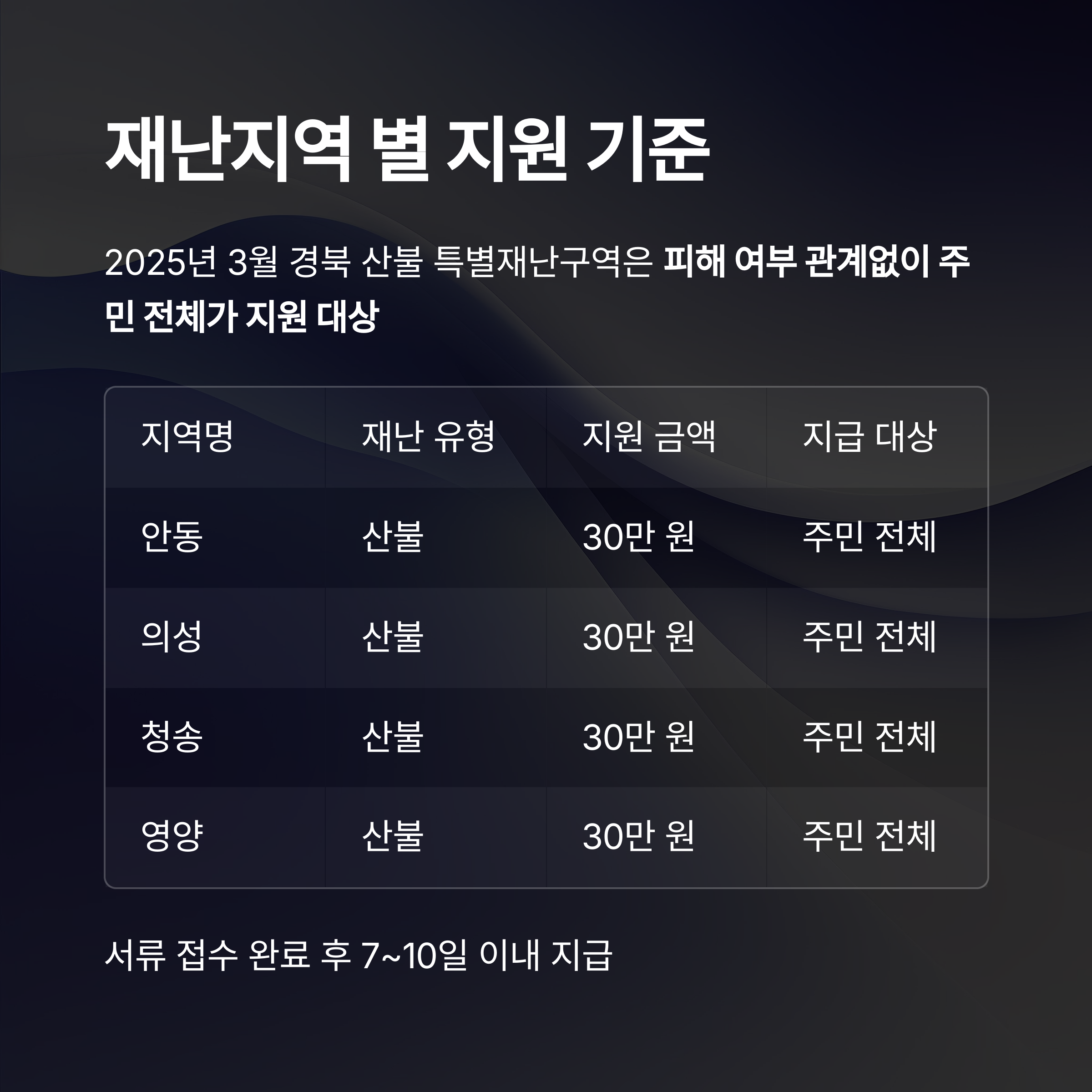 | 청송 | 산불 | 30만 원 | 주민 전체 |
