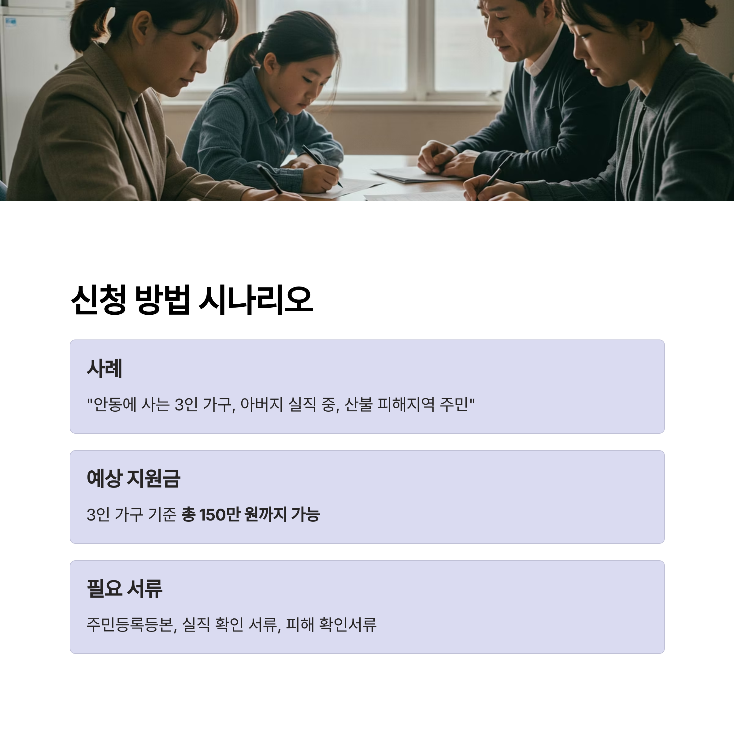 "저는 안동에 사는 3인 가구입니다. 아버지는 실직 중이고, 산불 피해지역 주민입니다."