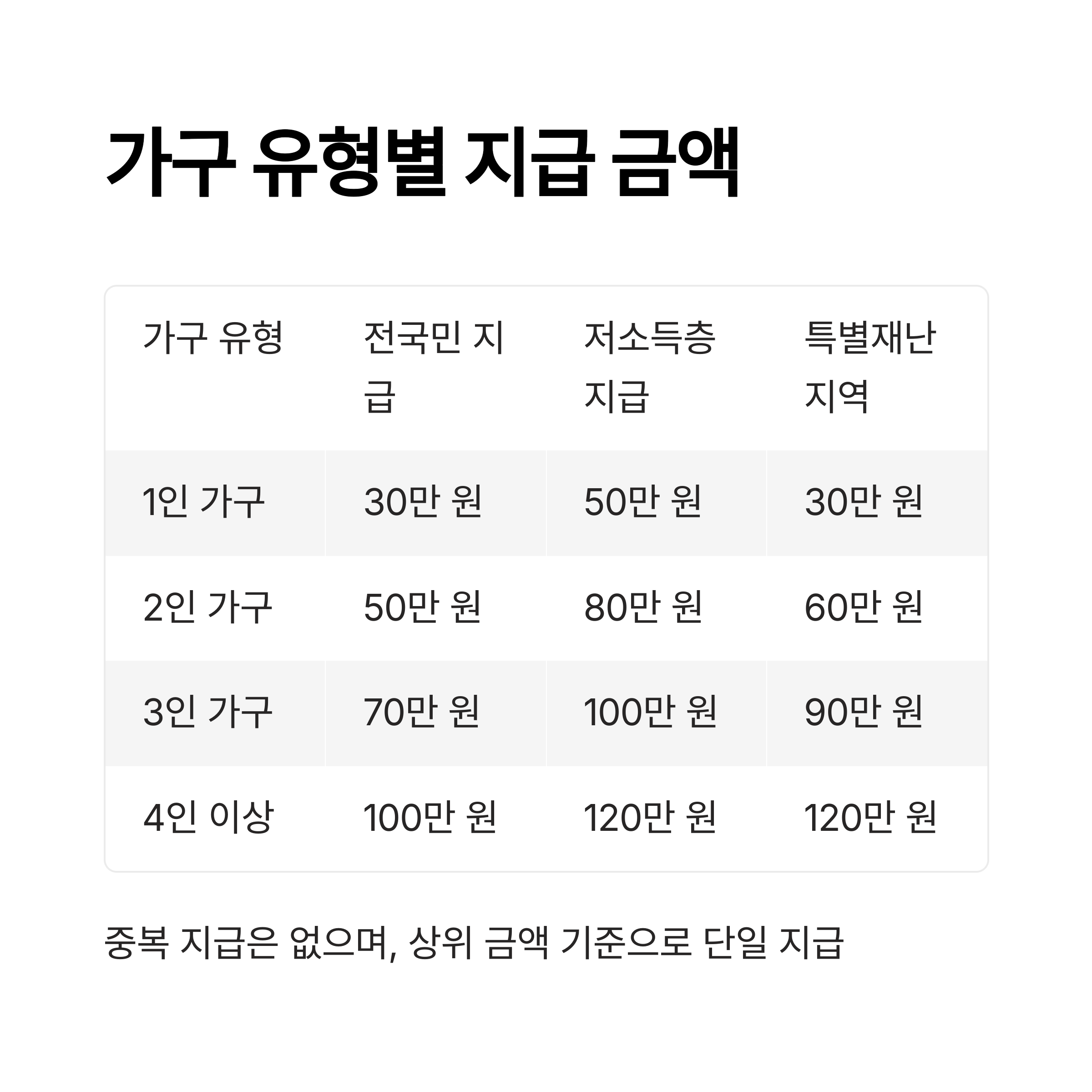 | 가구 유형 | 전국민 지급 | 저소득층 지급 | 특별재난지역 지급 |