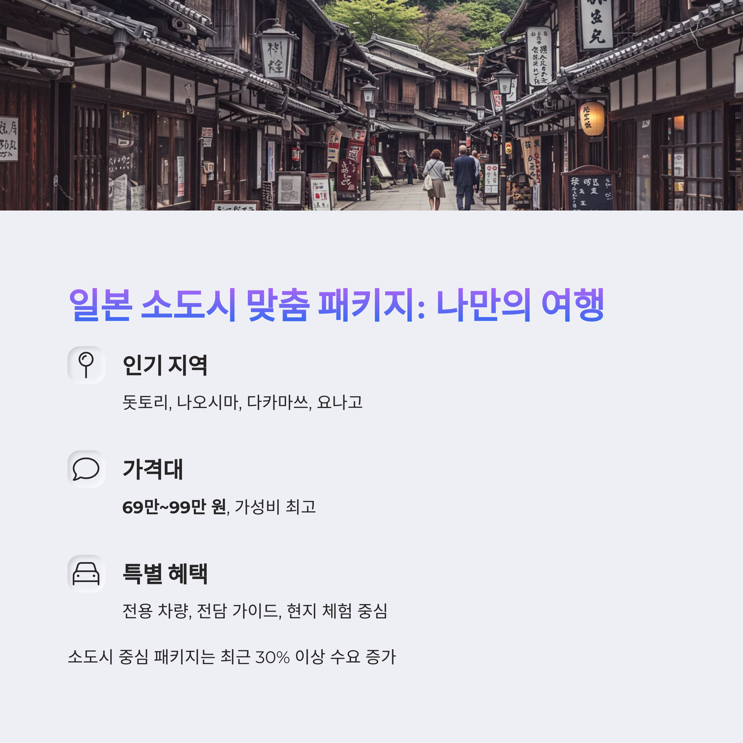 | 소도시 단독 패키지 | 3~4일 | 69만~99만 원 | 전용차량+테마 중심 소규모 맞춤형 |