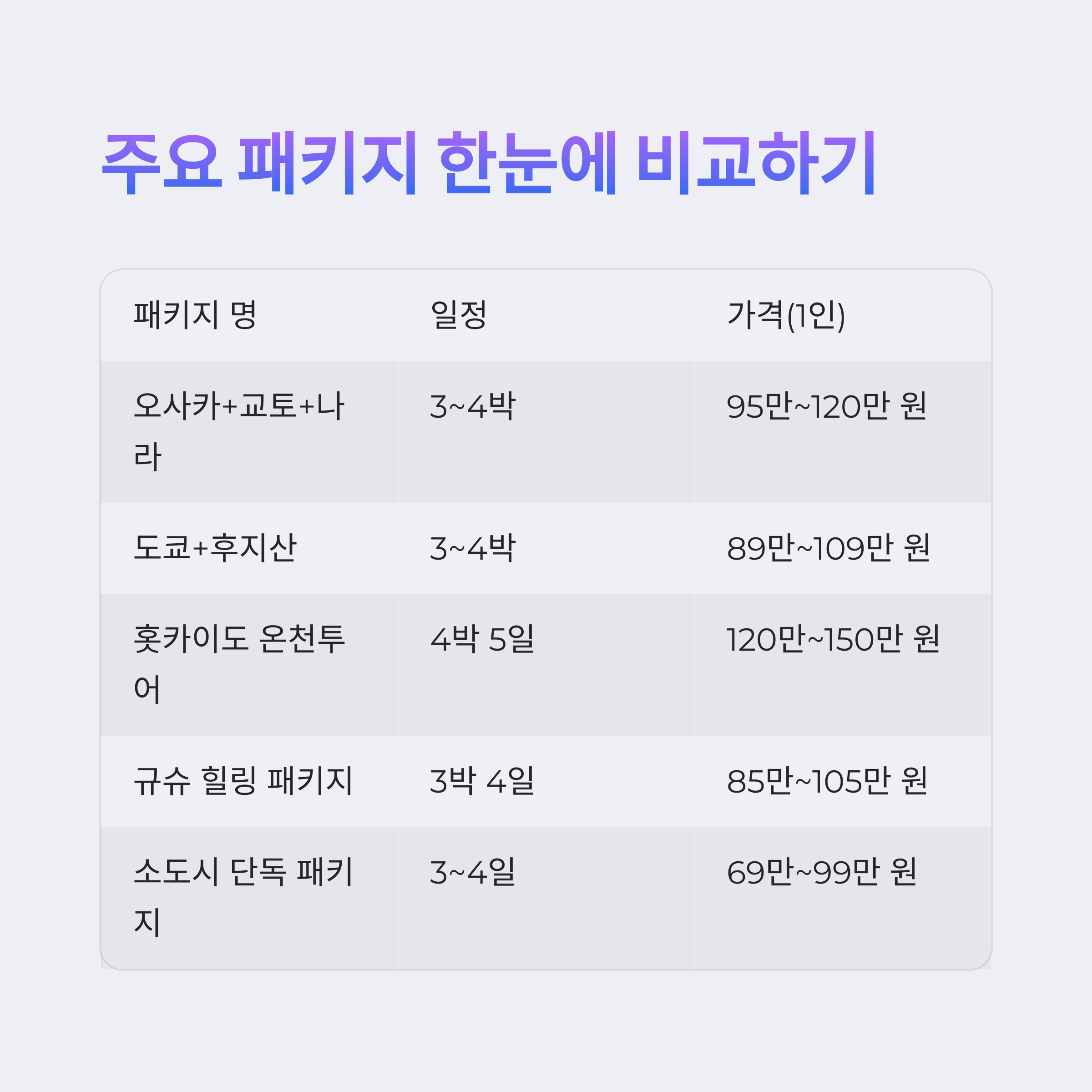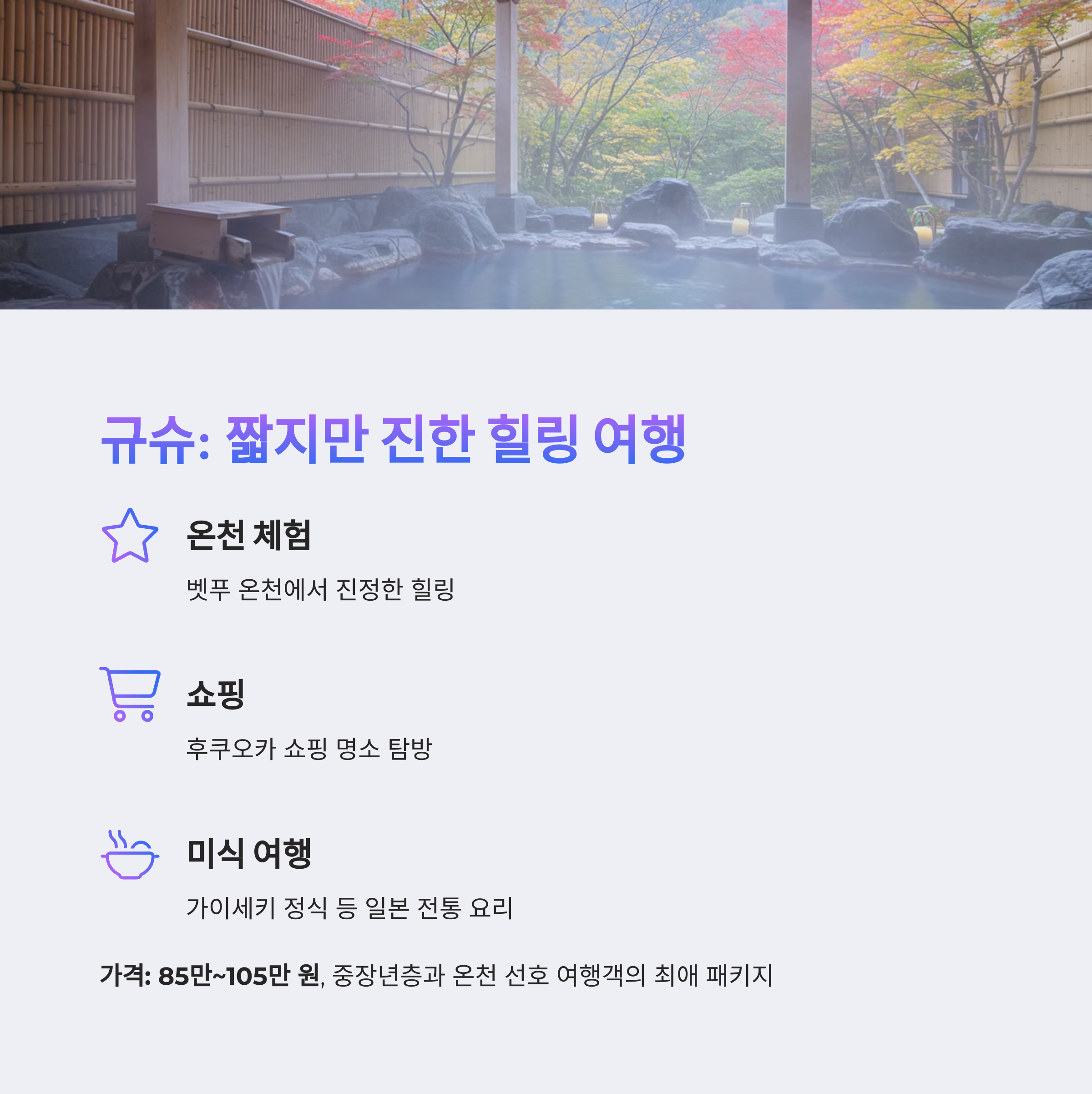 | 규슈 힐링 패키지 | 3박 4일 | 85만~105만 원 | 온천+가이세키+소도시 감성 |