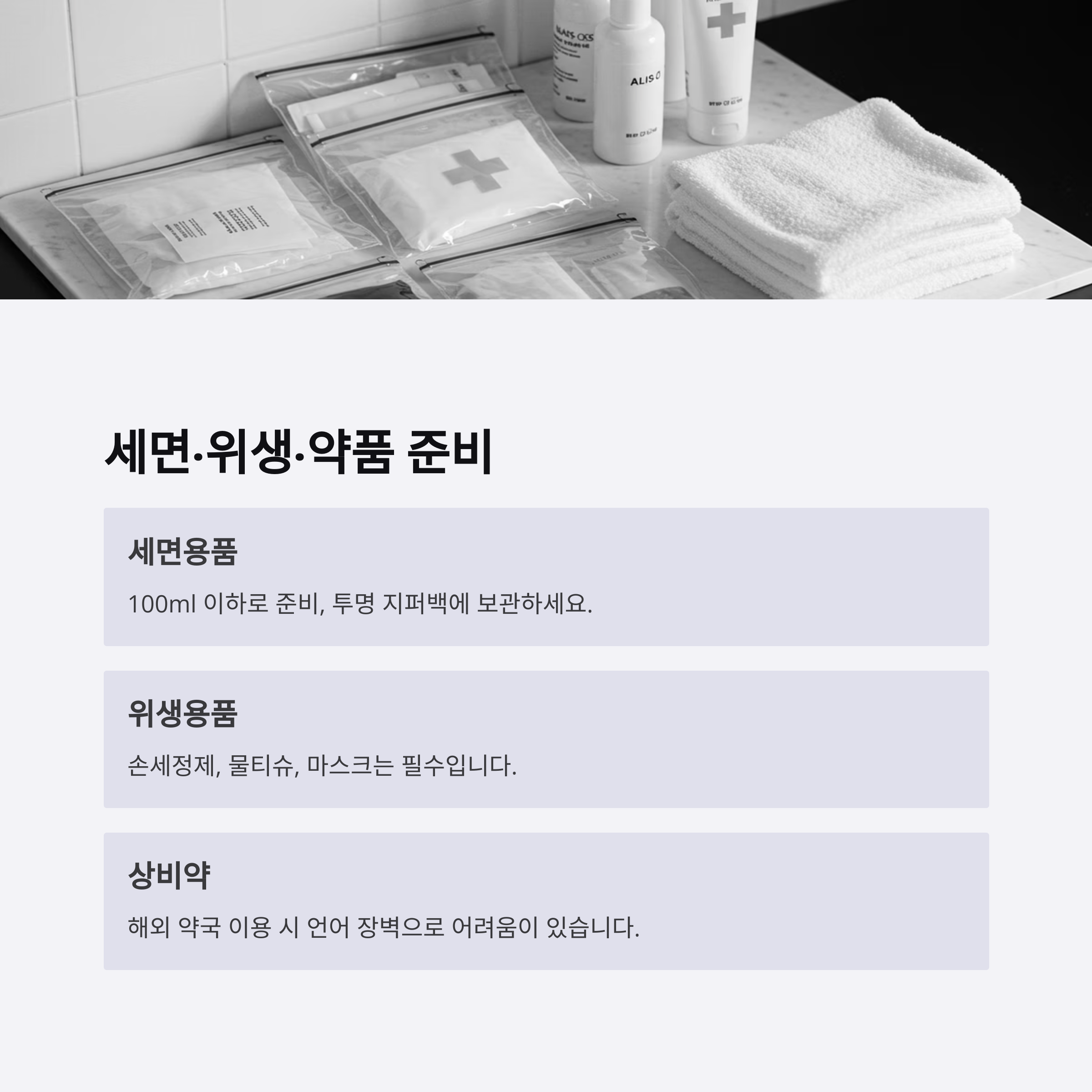 | 세면/약품 | 세면도구, 마스크, 상비약 | 액체류는 이중 포장 |