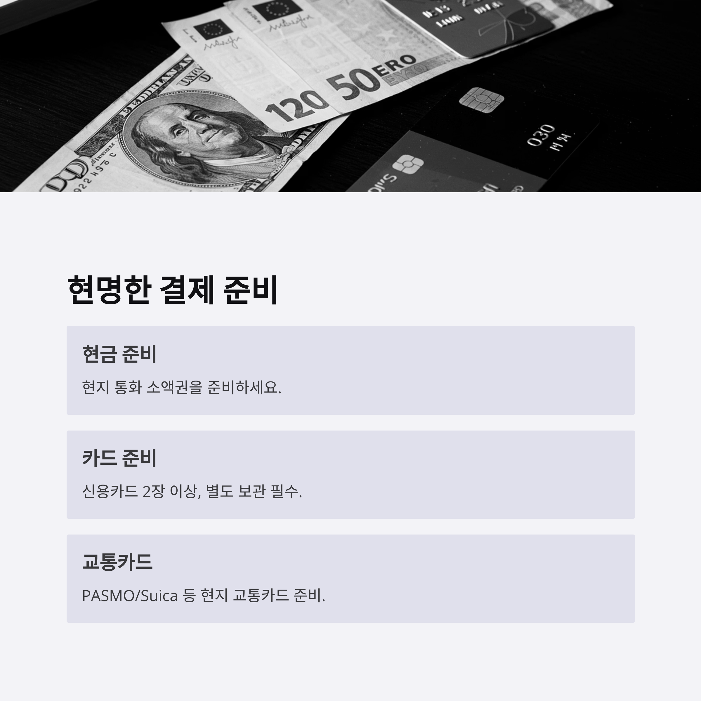 현지 통화 소액권을 준비하고, **교통카드(PASMO/Suica 등)**를 함께 챙기면