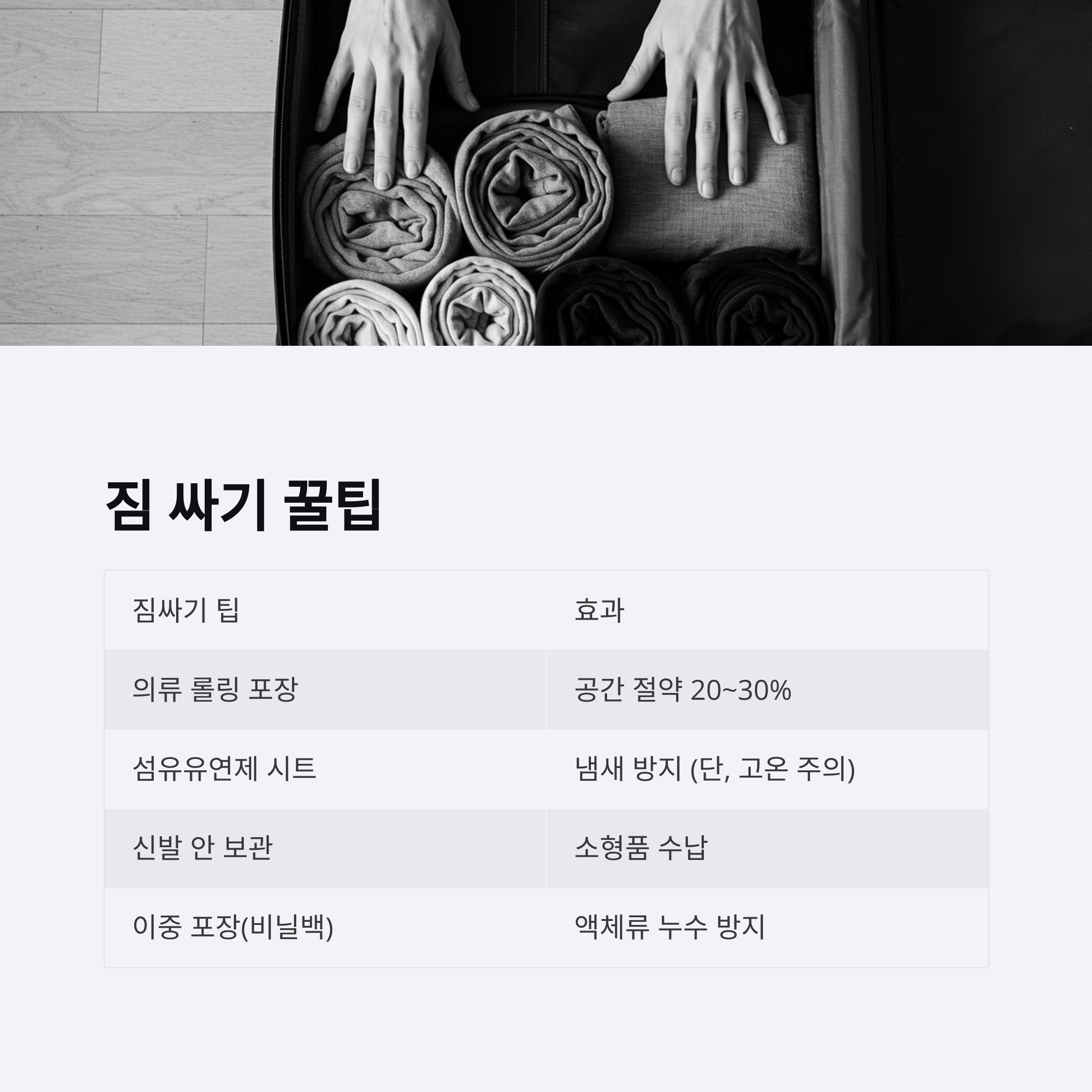 짐 공간을 아끼고 싶다면 신발 안에 양말과 속옷을 말아 넣는 속포장 전략도 유용합니다.
