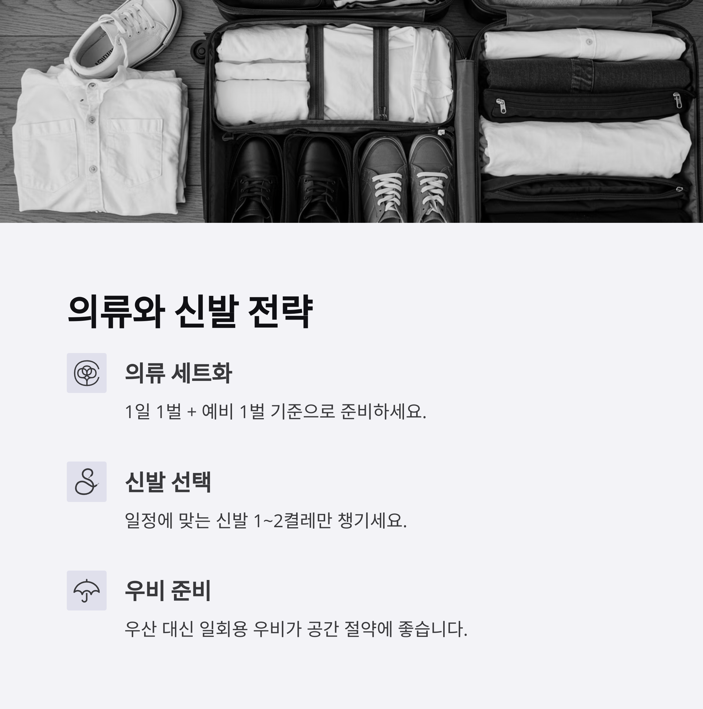 의류는 여행일정별로 세트 구성하고, 2~3일 세탁 주기를 고려해 최소화해야 합니다.