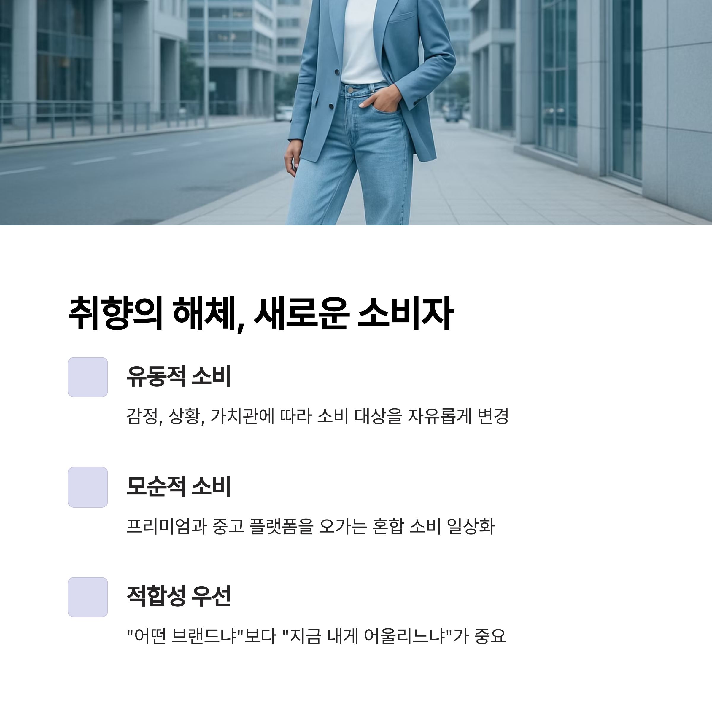 이들은 한쪽으로 편향되지 않으며, 오늘은 프리미엄, 내일은 중고 플랫폼을 이용하는 등 모순적 소비 행태조차 일상화되어 있습니다.