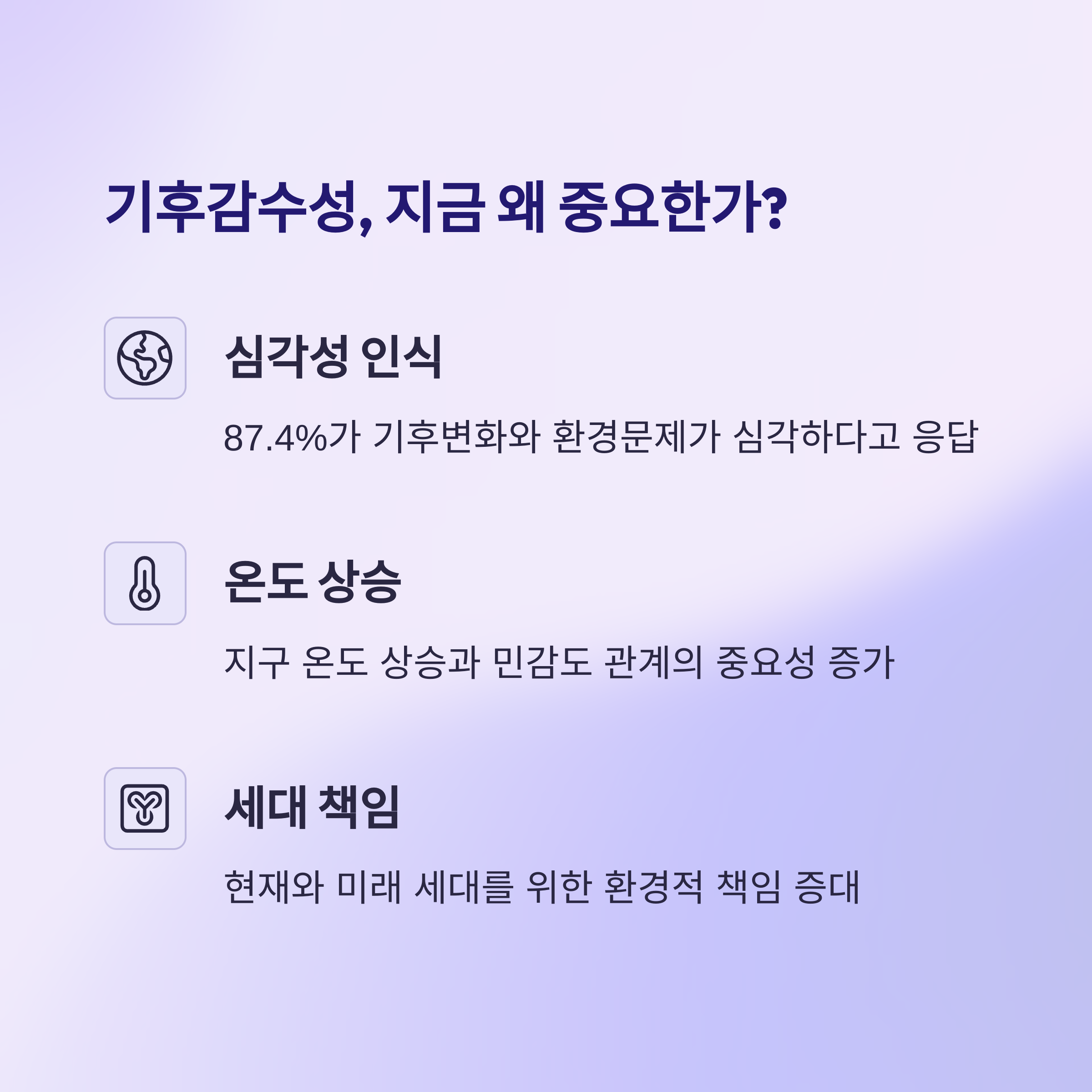 "기후감수성은 2025년 '트렌드 코리아'가 선정한 10대 소비 트렌드 중 하나로, 기후 변화가 당장 해결해야 할 '현존하는 위험'이라는 사회적 인식이 확산되고 있음을 보여줍니다."