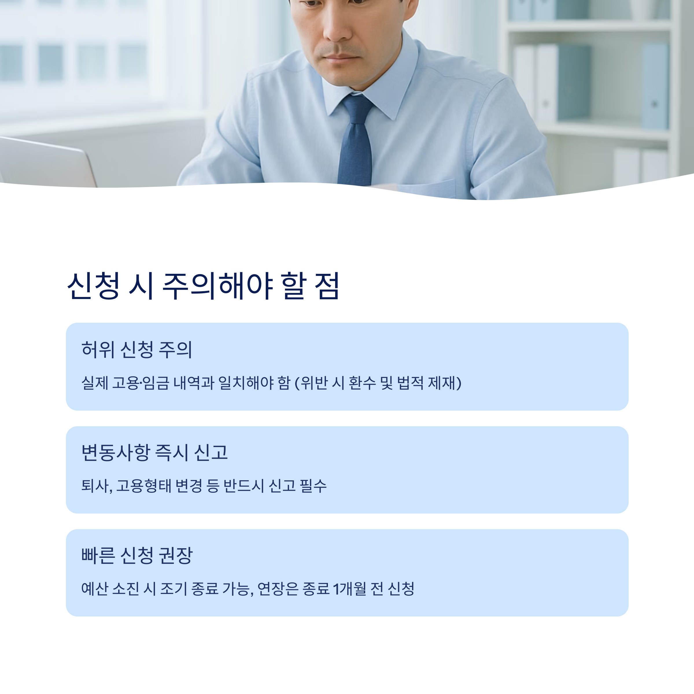 허위 신청 시 지원금 환수 및 법적 제재를 받을 수 있으므로 반드시 실제 근로자 고용 및 임금 지급 내역을 정확히 제출해야 합니다.