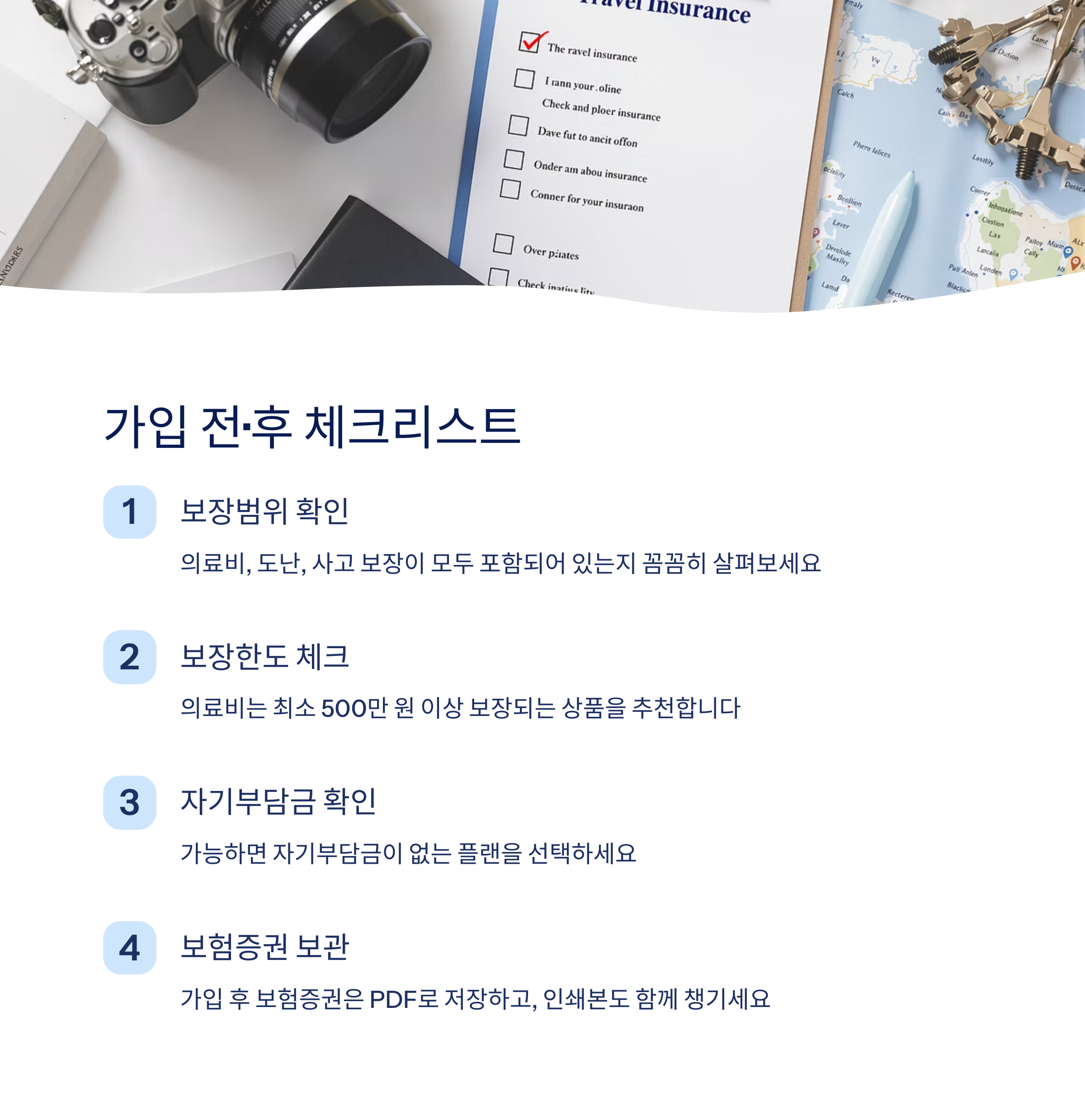 - 보장범위: 의료비, 도난, 사고 보장 포함 여부 확인